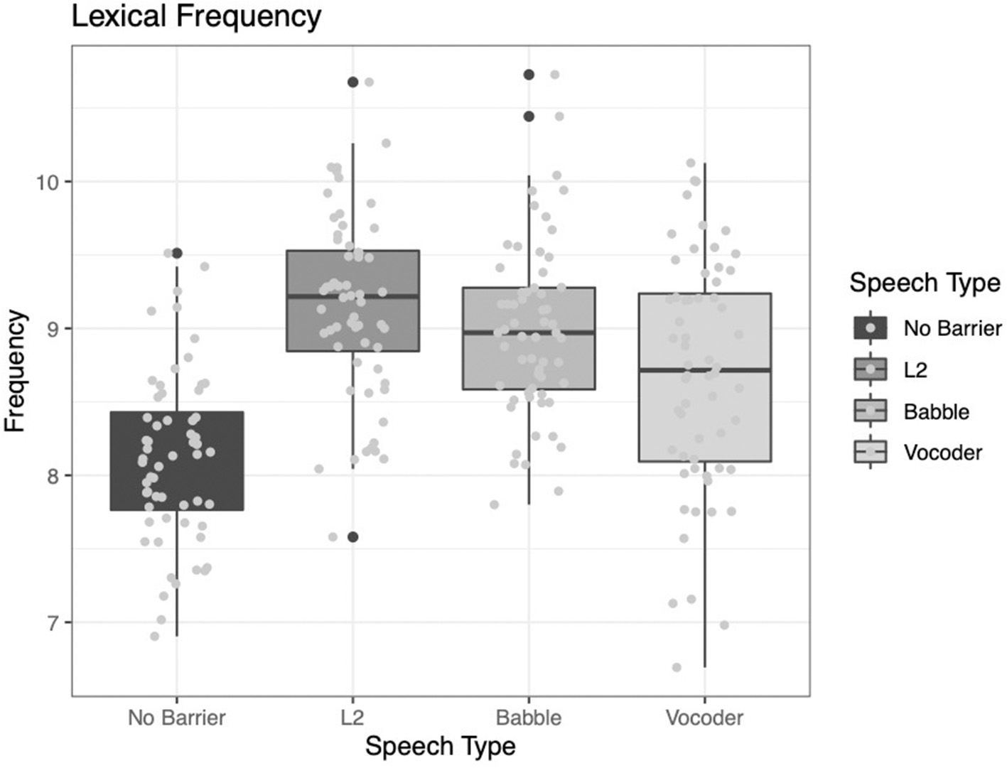 Two of the main effects significantly improved model fit for the analysis of lexical frequency. The comparison of the no-barrier condition to the other three conditions significantly improved model fit (χ2 = 66.666, p < 0.0001). The comparison of the L2 condition to the other two barrier conditions (babble and vocoded) also significantly improved model fit (χ2 = 12.225, p = 0.0005). However, the comparison between the babble and vocoded conditions did not significantly improve model fit (χ2 = 3.3212, p = 0.068).