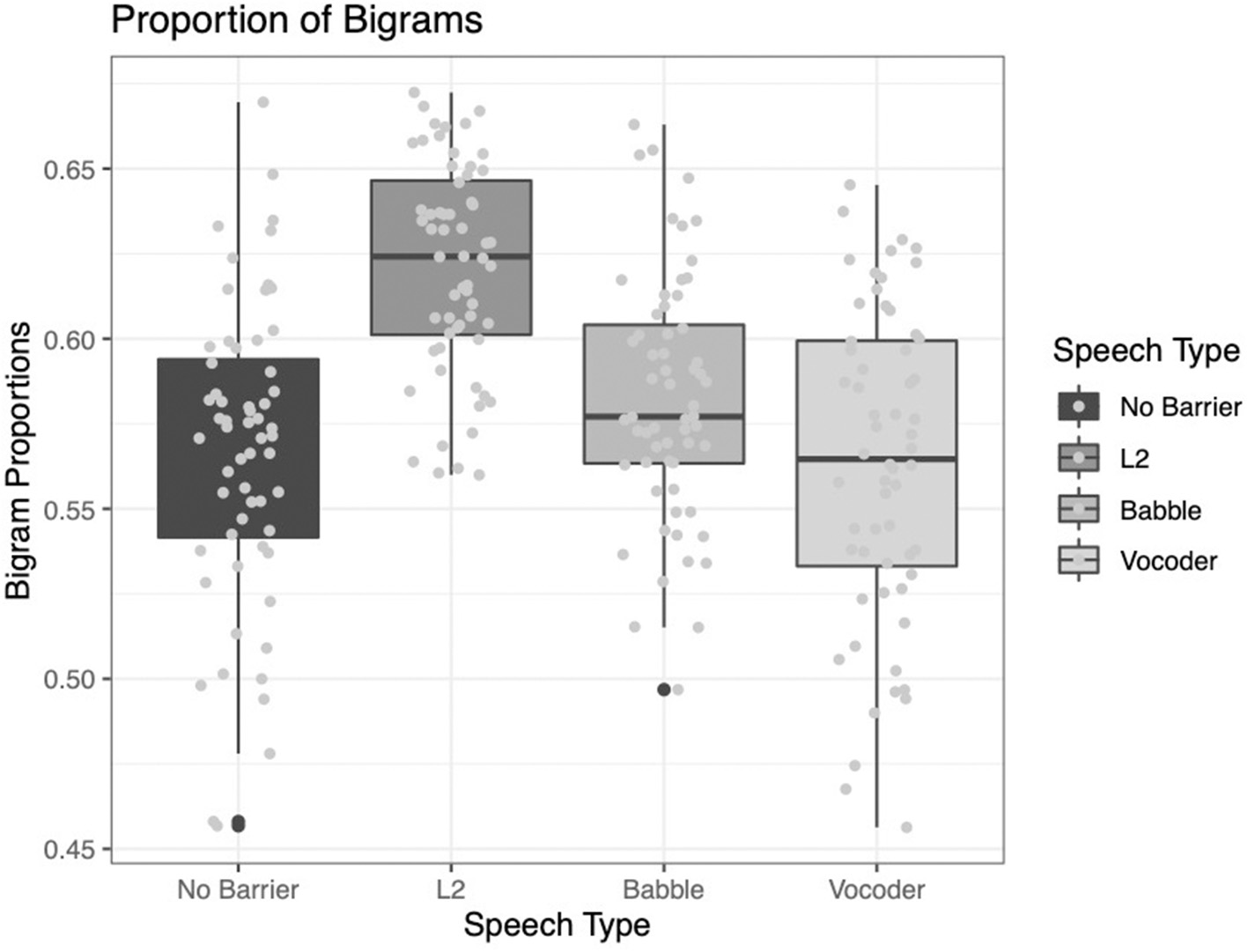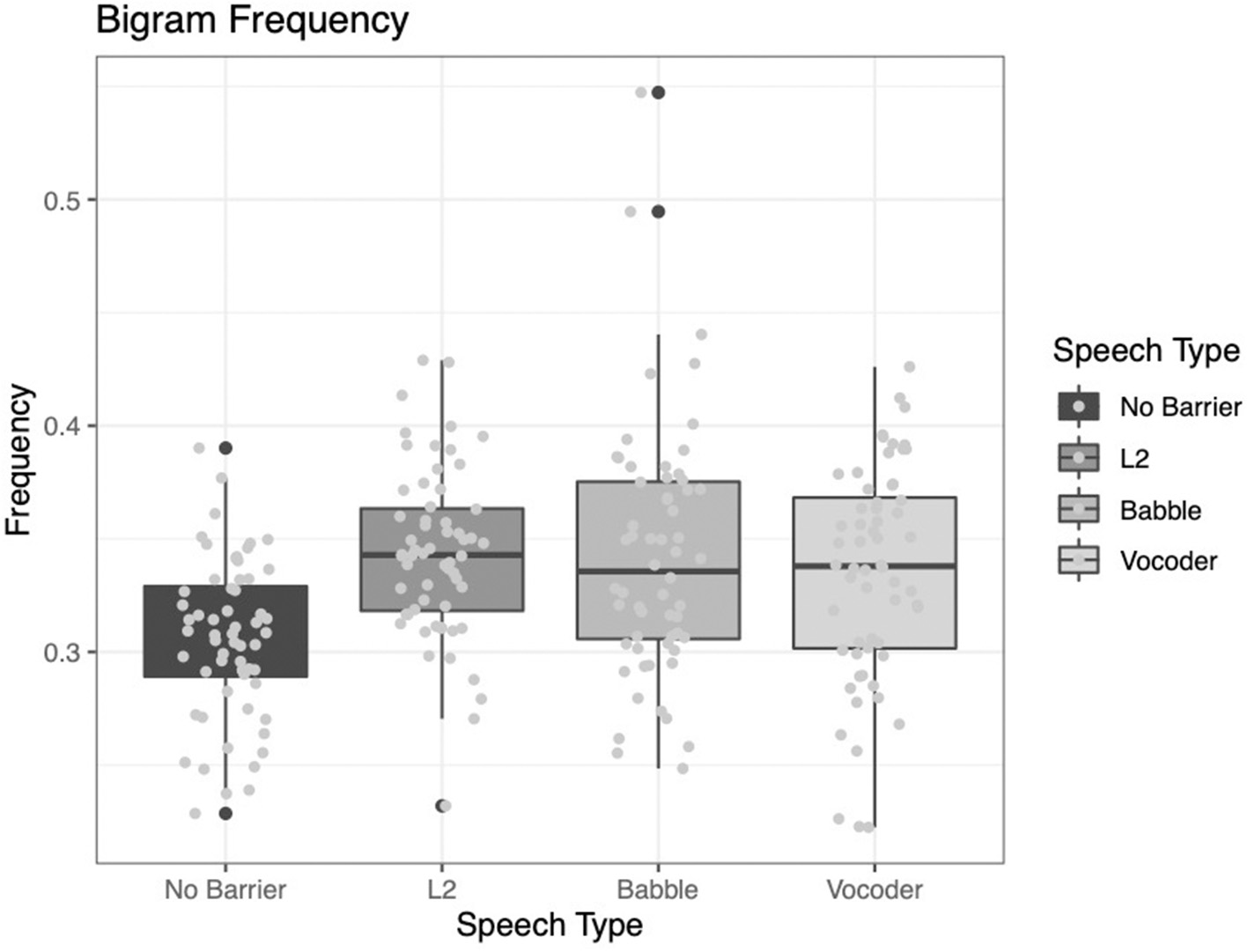 These results, too, diverge from some of the previously reported results. Examining Figure 7 below, we see that while the no-barrier condition shows the lowest bigram frequency, the other three conditions do not differ significantly from one another.