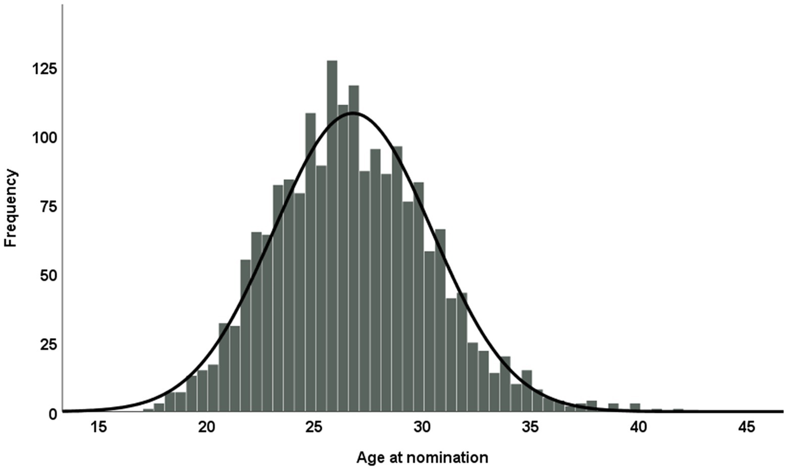 The subsample of confirmed retired players (n = 685) consisted of 8.6% goalkeepers, 17.0% defenders, 32.6% midfielders, and 41.8% forwards. The number of nominations was normally distributed by age; the most frequent age at nomination was from 26 to 27 years (see Figure 3).