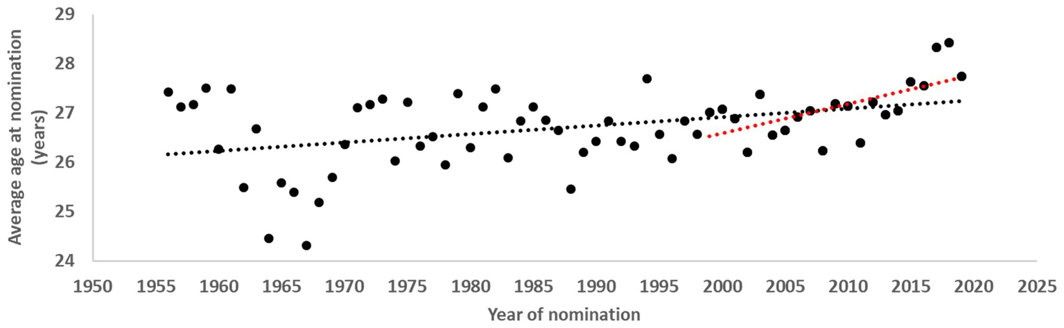 As can be seen in Figure 2, the mean age at nomination for each year increased, culminating with a mean age at nomination of 28.4 years in 2018. From 1956 to about 1967, the average age at nomination dropped from about 27.5 to 24.5 years before increasing again to reach the initial 1956 values in 1973. During 1974–2014, a period of rather stable ages at nomination was followed by a considerable increase of 1.3 years from 2014 to 2018. Thus, a significant relationship was found between year of nomination and average age at nomination during the period 1956–2019 (r = 0.41, p < 0.01). For the most recent 2 decades (1999–2019), an even stronger statistical relationship was found between year of nomination and average age at nomination (r = 0.63, p < 0.01).