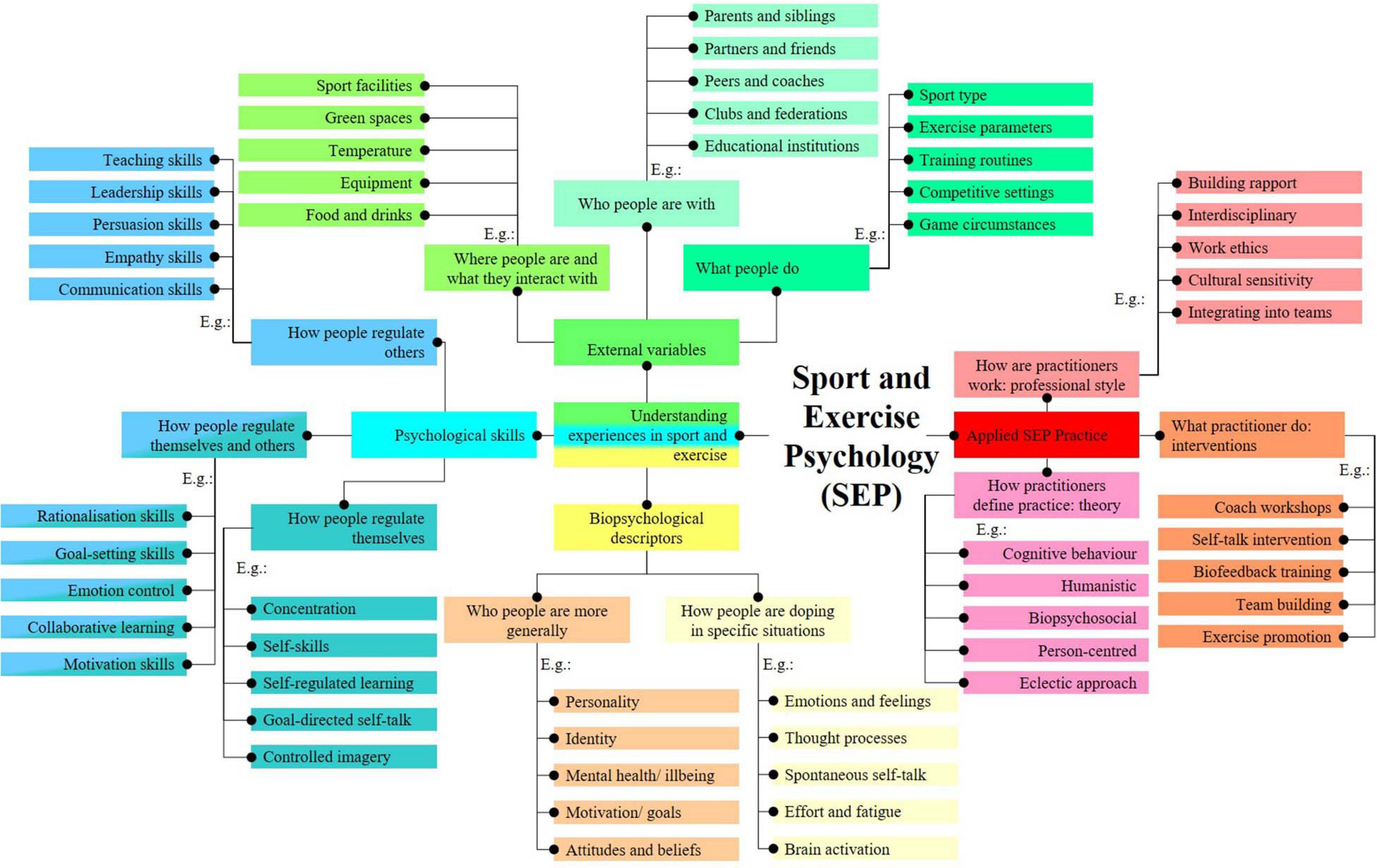 With regard to the four basic clusters, topics could be identified that further organize SEP concepts. Biopsychological descriptors help answer the questions of who people are (e.g., with personality traits) and how they are in certain situations (e.g., with emotion concepts). External variables help answer the questions of where people are and what they interact with (e.g., description of sports facilities and equipment), who they are with (e.g., description of social networks), and what they do (e.g., description of task constraints). Psychological skills include concepts that refer to what people do to regulate themselves (e.g., through relaxation skills), what people do to regulate others (e.g., through modeling skills), and what people do to regulate both themselves and others (e.g., through emotion control skills). Finally, applied SEP practice research contains concepts that explain how practitioners define practice (e.g., through humanistic approaches), how practitioners work (e.g., in interdisciplinary teams), and what practitioners do (e.g., quiet eye training). In Figure 1, a selection of five examples was added to each sub-category to illustrate where a particular SEP concept might fit.