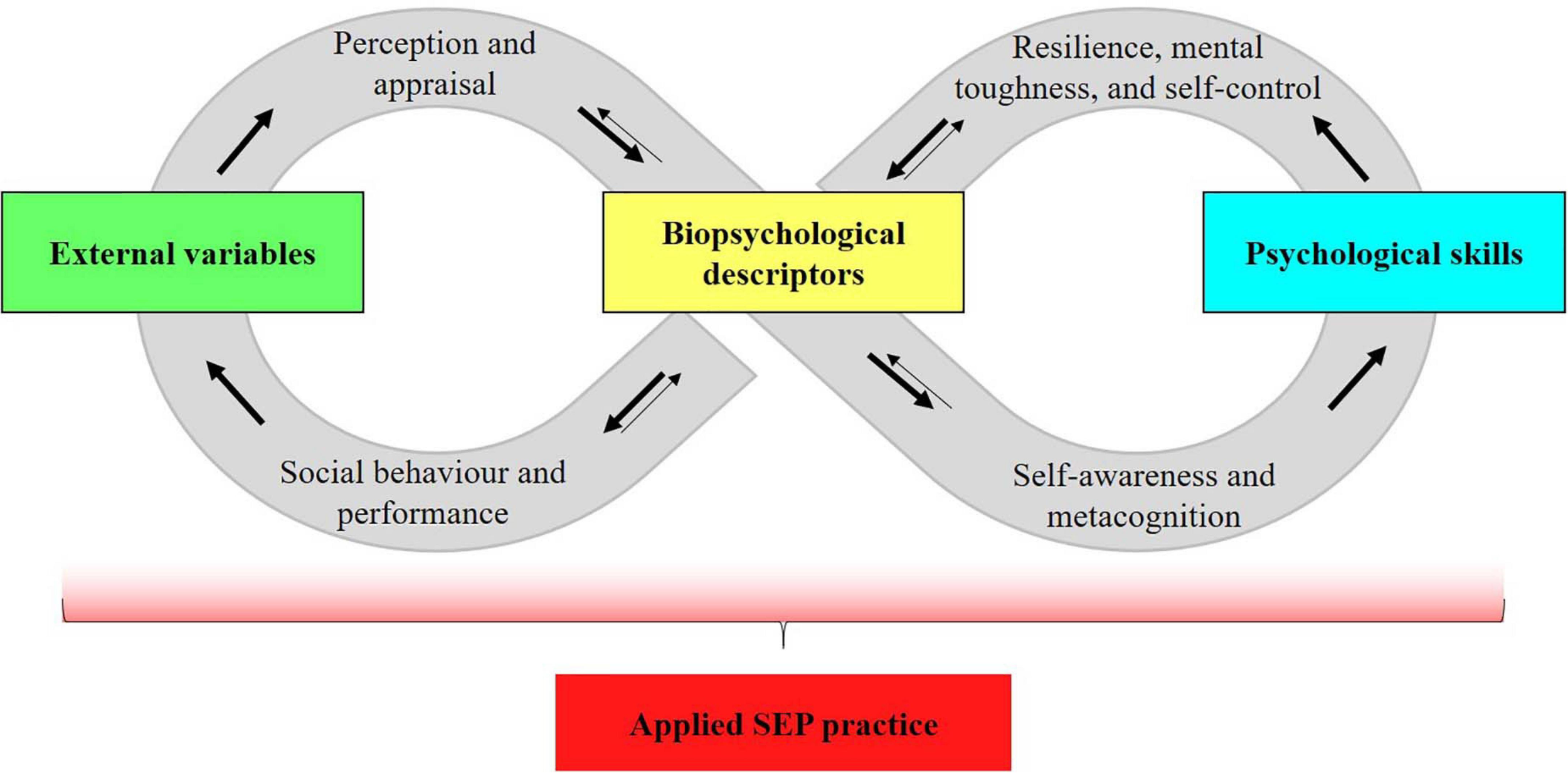 Some of the dominant theories in SEP explain parts of the interaction between external variables and biopsychological descriptors. For example, ecological dynamics to decision making assumes that behavior emerges from the performer-environment system and that both performer and environment continuously shape one another (Araújo et al., 2019). Self-determination theory suggests that the motivation to engage in physical activity is shaped by the physical and social environment in which physical activity takes place (Ng et al., 2012). Finally, flow theory describes the psychological process that involves intense focus and absorption in a particular activity, in which athletes are in harmony with their task environment without the need for effortful controlled mental processes (i.e., use of psychological skills; Swann et al., 2018). Overall, it can be assumed that the dynamic relationship between external variables and biopsychological descriptors has been one of the major research interests of SEP.