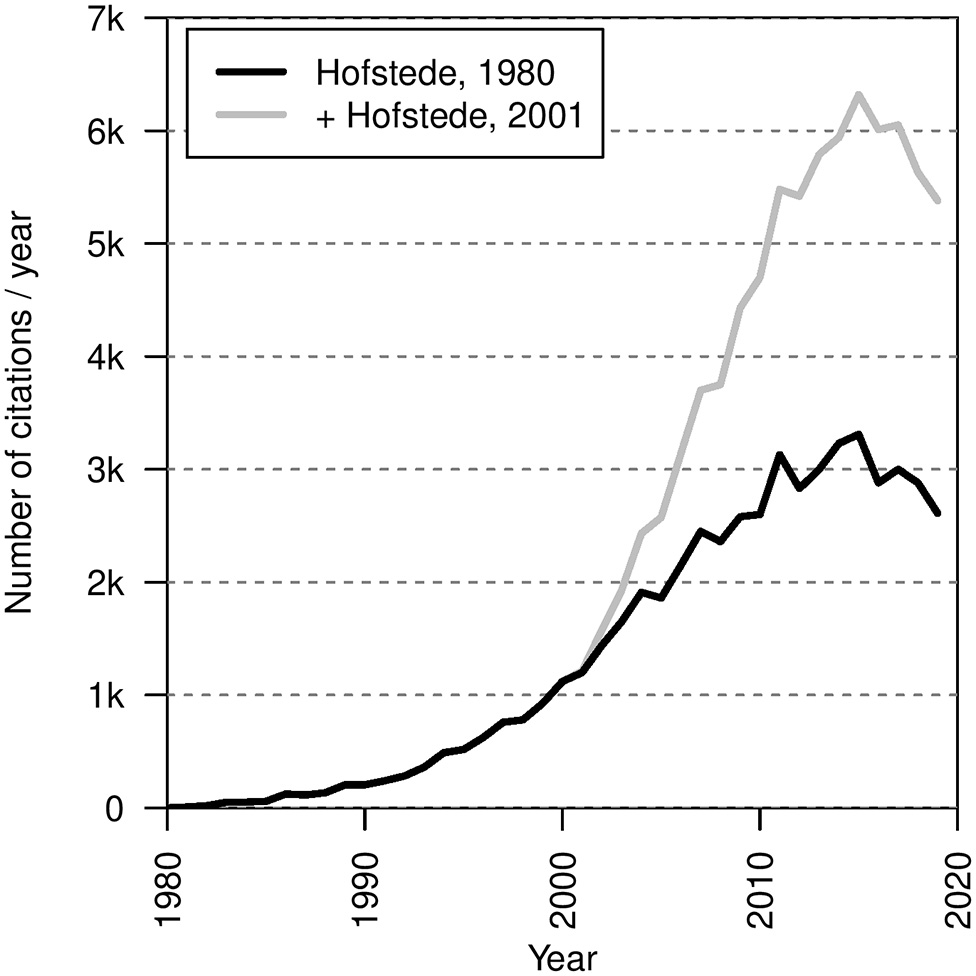 Figure 1. Number of publications in thousands citing Hofstede (1980, 2001) per year (1980–2019). Data taken from a Google Scholar (scholar.google.com) search for all publications. The black line indicates the number of citations of the seminal investigation only (Hofstede, 1980). The gray line includes citations of the second edition (Hofstede, 2001) in addition to the seminal investigation.