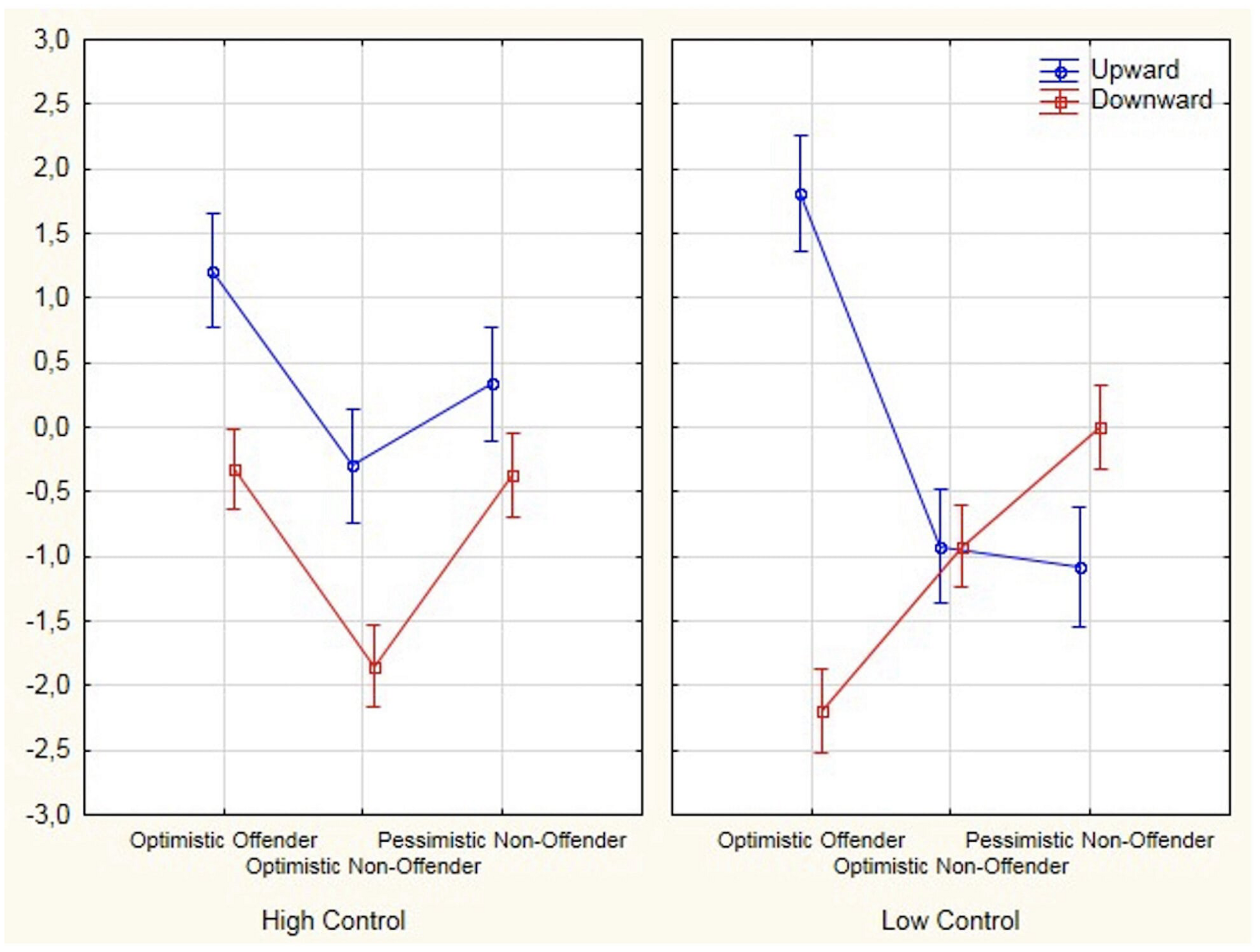 The experimental design of the study considered the following variables: group study (optimistic offenders, optimistic non-offenders, and pessimistic non-offenders) and task condition (high control vs. low control), with two dependent variable resources in upward and downward counterfactual thinking.
