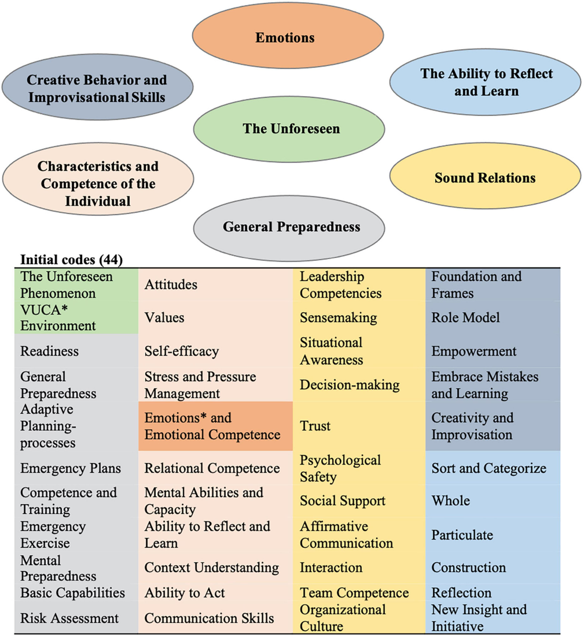 Map of overall themes derived from initial coding. The colored background represents the linking and grouping of the initial codes into emerging overall themes. ∗VUCA, Volatile, Uncertain, Complex, and Ambiguous (Barber, 1992). ∗Emotions emerged as a main theme evident across all professional experts. Initial sub-coding of emotions: negative emotions, positive emotions, fear, shock, panic, surprise, interest, mood, language, metaphors, metaphorical expressions, sensemaking, levels of emotions, emotional capital, emotional intelligence, emotional dissonance, emotional incongruence, emotionally contagious.