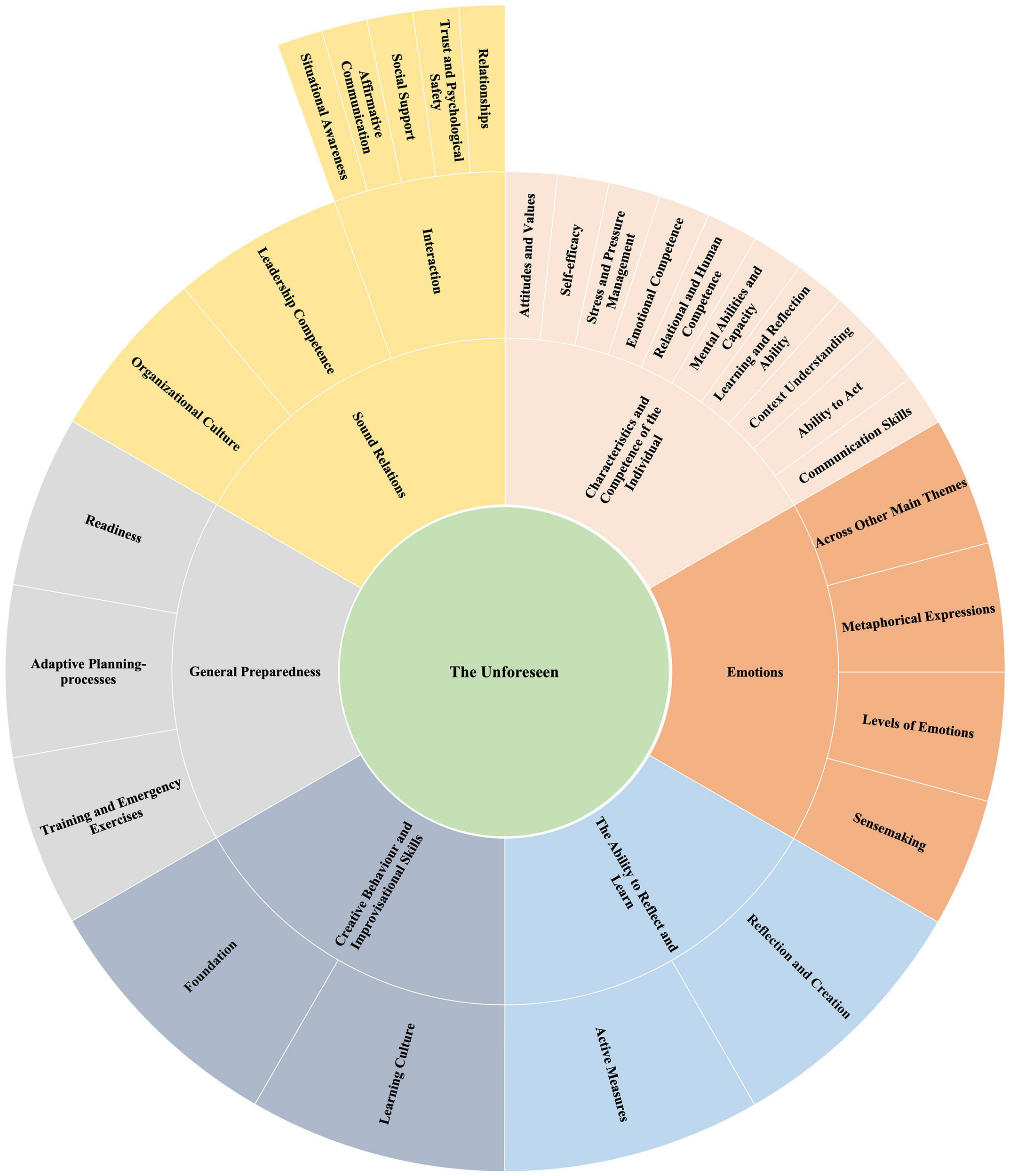 The high impact of unforeseen events in a globalized world accentuates the importance of a greater in-depth and broader understanding of resilient competencies that can promote performance. Traditional research has, however, paid relatively little attention to uncertainty and unpredictable conditions, including the particulate competence of the unforeseen, and how organizations can achieve degrees of resilience. Hence, the purpose of this study is to explore whether there are types of competence at the individual, social and organizational level that can enhance preparedness to face the unforeseen. The first aim was to explore how highly experienced professionals from different sectors and organizational levels describe and understand the nature and function of the unforeseen phenomenon. The second aim was to explore what resilient competencies can be beneficially applied in organizations to enhance performance irrespective of the scenario or event that occurs. The generic qualitative approach of this study employed semi-structured interviews. The purposive expert sample of 13 highly knowledgably Norwegian professionals with unique and extensive cross-sectorial experience of unforeseen events were selected. Ages ranged from 41 to 62 years (M = 48.92, SD = 6.94), length of professional experience and education ranging from 22 to 43 years. Thematic analysis of interview transcripts and the interpretation displayed six types of resilience competence: (1) General Preparedness, (2) Characteristics and Competence of the Individual, (3) Sound Relations, (4) Creative Behavior and Improvisational Skills, (5) The Ability to Reflect and Learn, (6) Emotion Efficacy. In addition, The Unforeseen was discerned as a complex phenomenon. These findings emphasize a cross-disciplinary perspective and provides integrative multilevel insight into the particulate competence of the unforeseen by introducing a framework that serves as a foundation for future research and as a tool for practitioners working in the field.