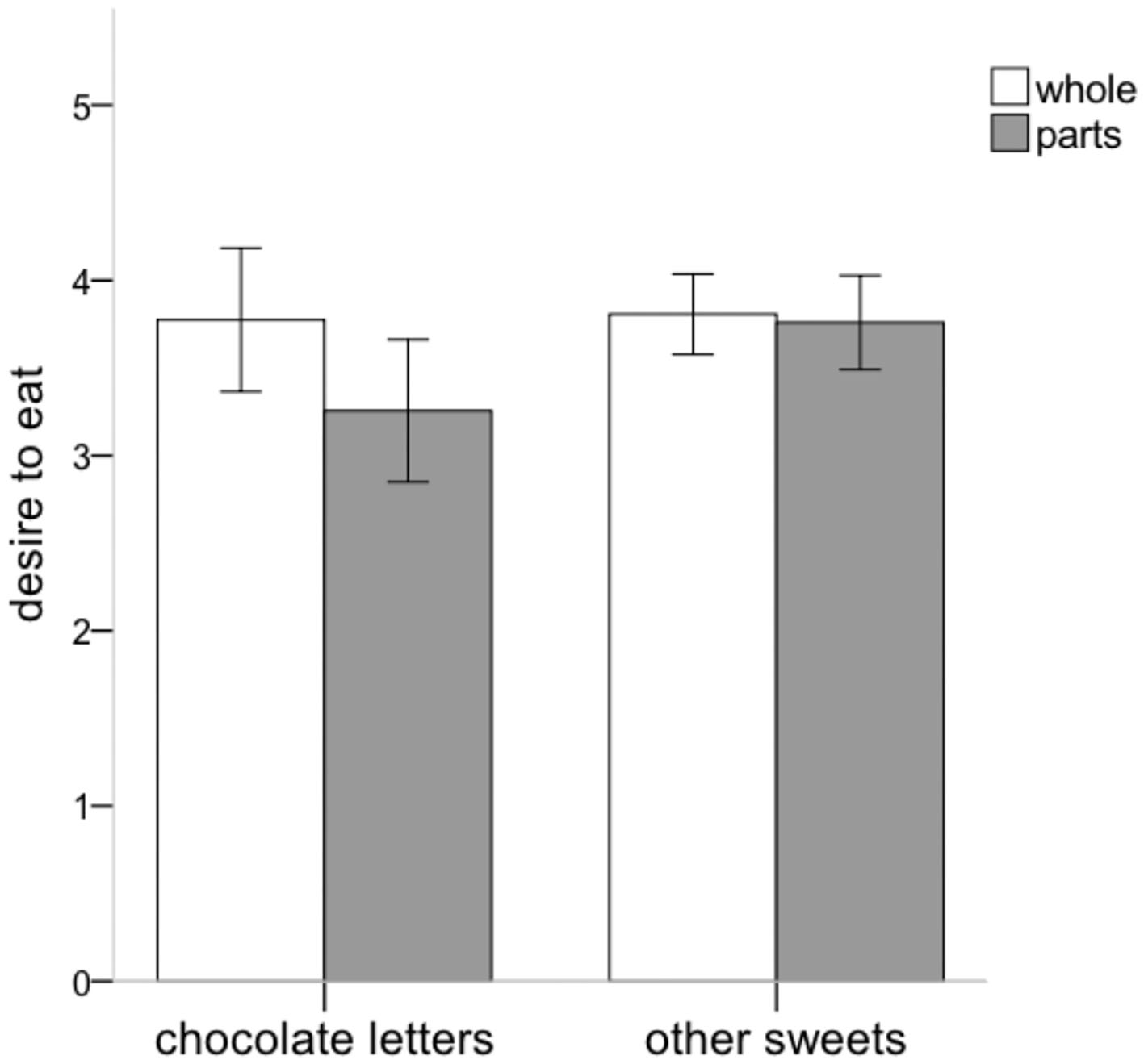 In sum, using a controlled and well-established manipulation of perceptual focus, desire to eat chocolate letters was higher after focusing on the whole than on the parts of identical arrangements of chocolate (Navon) letters. The fact that the desire to eat chocolate letters in the whole condition is as high as the desire to eat other sweets (in both the whole and parts condition) might create the impression that focusing on the whole merely kept desire to eat unchanged, but lowered desire when focusing on the parts. This interpretation however hinges on the assumption that desire to eat is generally similar for chocolate letters and for the other sweets. Based on the available data, there is no way to ascertain this. Given that the other sweets presented to participants are presumably relatively popular and more familiar among the student public that participated in the study (more than chocolate letters), it appears more likely that the base-level desire to eat these types of sweets is simply higher than the desire for chocolate letters, while simultaneously being insensitive to the perceptual focus manipulation in the present study.