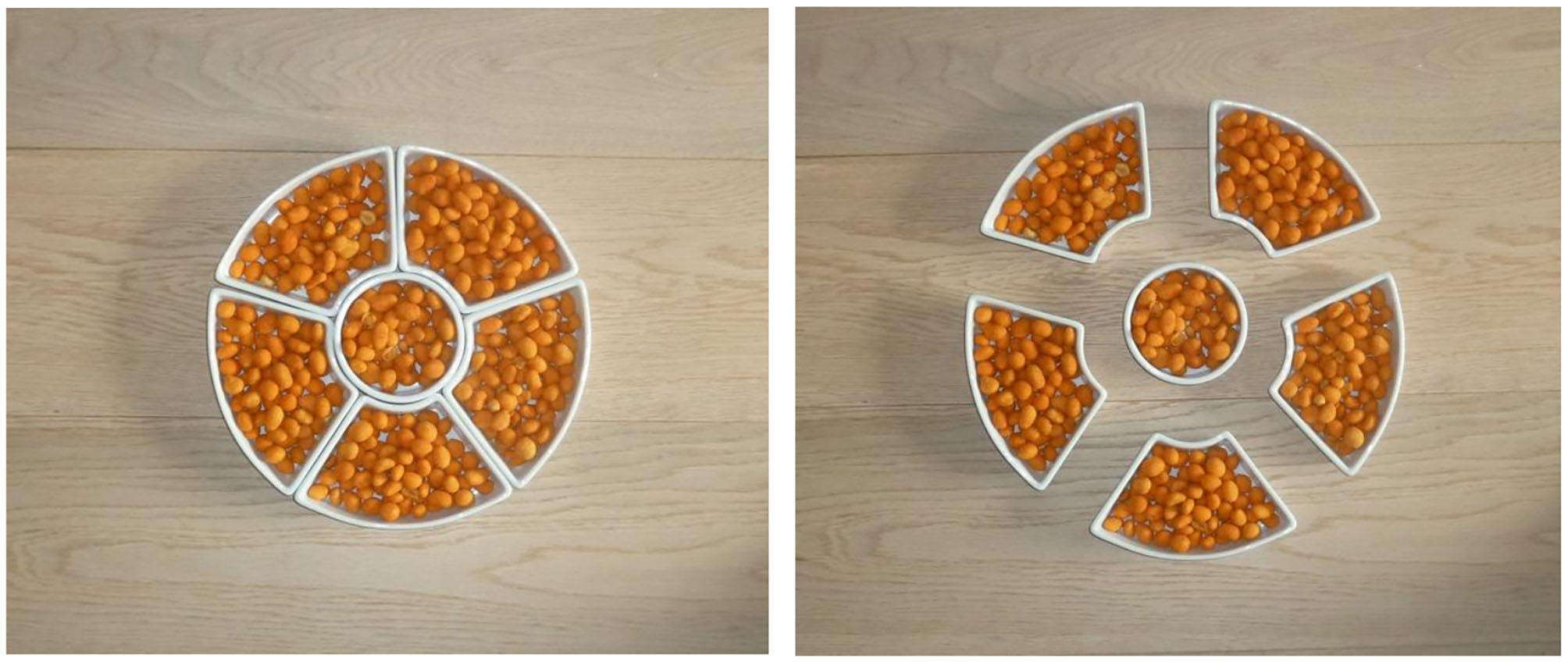 In Study 3, we examined whether mere perceived size differences between similar food wholes would suffice to lead to differences in desire to eat, as the Gestalt bias suggests. We tested this notion by arranging lazy susan cups filled with nuts into a circular shape, either in a tight or in a looser arrangement (Figure 3). While in the looser arrangement, the individual cups were not joined together, we reasoned that participants would nevertheless perceive the collection of cups to form a circle, due to the Gestalt principle of closure (i.e., tendency to perceptually close gaps between distinct elements). As the circumference of the (imaginary) circle in the looser arrangement is by definition larger than the circumference of the tight arrangement of cups, we expected that—by the logic of the Gestalt bias—participants would have a higher desire to eat nuts in the former than the latter condition.
