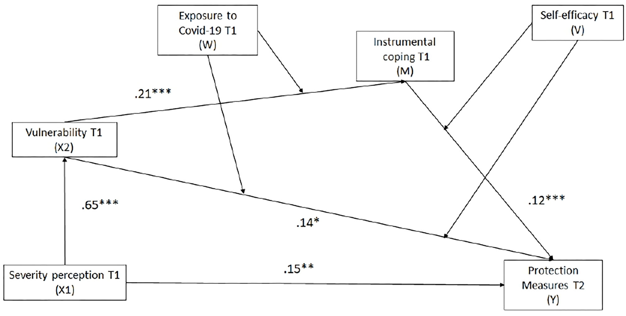 Second, we integrated the proposed moderator variables (self-efficacy and exposure to COVID-19 in T1) into the model and empirically tested the overall moderated mediation hypothesis (Hypothesis 3). Self-efficacy was construed as a dummy variable (0 = low self-efficacy; 1 = high self-efficacy) based on the mean scores. We tested the indirect effects including each moderator separately. Then, a pair of two-way interactions were used to test moderation in the path model along with the main effects: X2*W: Perceived vulnerability * contracting COVID-19 (W1 = 0: no direct exposure COVID-19 vs. W2 = 1: direct exposure COVID-19) and M*V: instrumental coping * self-efficacy (V1 = 0: low self-efficacy and V2 = 1: high self-efficacy). Hence, assuming this moderation hypothesis receives empirical support, it is plausible to assume that the strength of the hypothesized indirect effect (mediation) is conditional on the value of the moderators (exposure, or not, to COVID-19 and low/high perceived self-efficacy) when controlling for sex, age, and protection measures in T1.