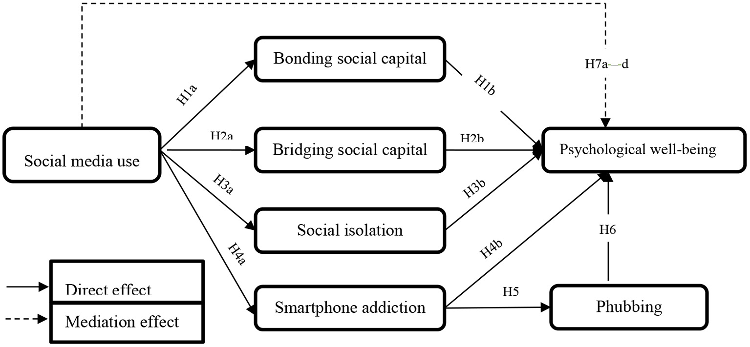 H7: (a) Bonding social capital; (b) bridging social capital; (c) social isolation; and (d) smartphone addiction mediate the relationship between social media use and psychological well-being.