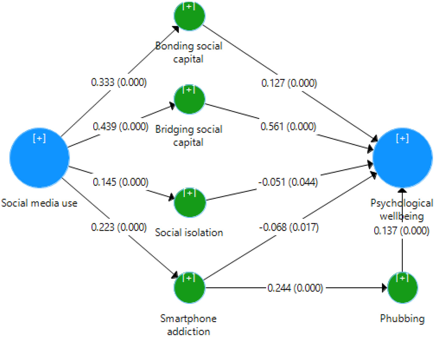 Table 5 reveals that all hypotheses of the study were accepted base on the criterion (p-value < 0.05). H1a (β = 0.332, t = 10.283, p = 0.001) was confirmed, with the second most robust positive and significant relationship (between social media use and bonding social capital). In addition, this study evidenced a positive and significant relationship between bonding social capital and psychological well-being (β = 0.127, t = 4.077, p = 0.001); therefore, H1b was accepted. Regarding social media use and bridging social capital, the present study found the most robust positive and significant impact (β = 0.439, t = 15.543, p = 0.001); therefore, H2a was accepted. The study also evidenced a positive and significant association between bridging social capital and psychological well-being (β = 0.561, t = 20.953, p = 0.001); thus, H2b was accepted. The present study evidenced a significant effect of social media use on social isolation (β = 0.145, t = 4.985, p = 0.001); thus, H3a was accepted. In addition, this study accepted H3b (β = −0.051, t = 2.01, p = 0.044). Furthermore, this study evidenced a positive and significant effect of social media use on smartphone addiction (β = 0.223, t = 6.241, p = 0.001); therefore, H4a was accepted. Furthermore, the present study found that smartphone addiction has a negative significant influence on psychological well-being (β = −0.068, t = 2.387, p = 0.017); therefore, H4b was accepted. Regarding the relationship between smartphone addiction and phubbing, this study found a positive and significant effect of smartphone addiction on phubbing (β = 0.244, t = 7.555, p = 0.001); therefore, H5 was accepted. Furthermore, the present research evidenced a positive and significant influence of phubbing on psychological well-being (β = 0.137, t = 4.938, p = 0.001); therefore, H6 was accepted. Finally, the study provides interesting findings on the indirect effect of social media use on psychological well-being (t-value > 1.96 and p-value < 0.05); therefore, H7a–d were accepted.