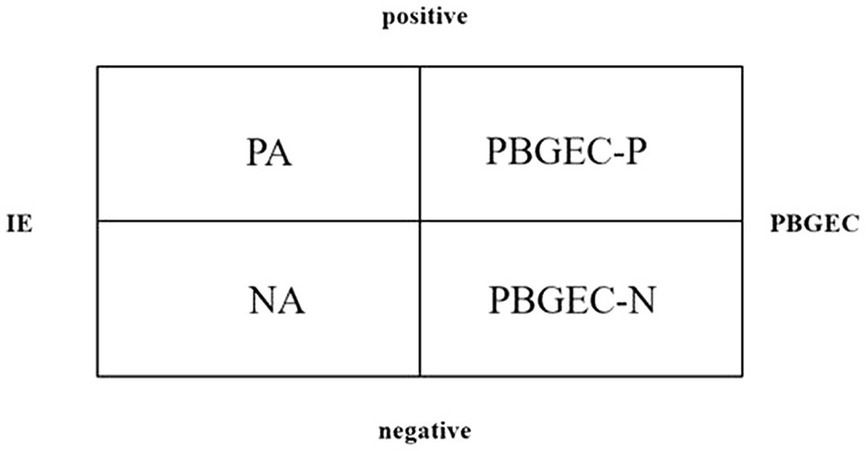 However, the precise mechanisms that underpin the construction of emotional climate remain rather unclear. This research demonstrates the existing link between personal emotions [measured specifically with the Positive and Negative Affect Schedule (PANAS); Watson et al., 1988] and PBGEC. We therefore predict that PBGEC and individual emotion will be distinct but related concepts. For Hypothesis 1, we predict that PBGEC and individual emotion will be related; i.e., the positive PBGEC (PBGEC-P) and negative PBGEC (PBGEC-N) will positively correlate with individual positive affect (PA) and negative affect (NA), respectively. In that, they will share the dimension of valence, but will focus on different subjects, and thus will form four groups (see Figure 1). In other words, we presume that PBGEC and individual emotion will conform to a four-factor model (PBGEC-P, PBGEC-N, PA, and NA).