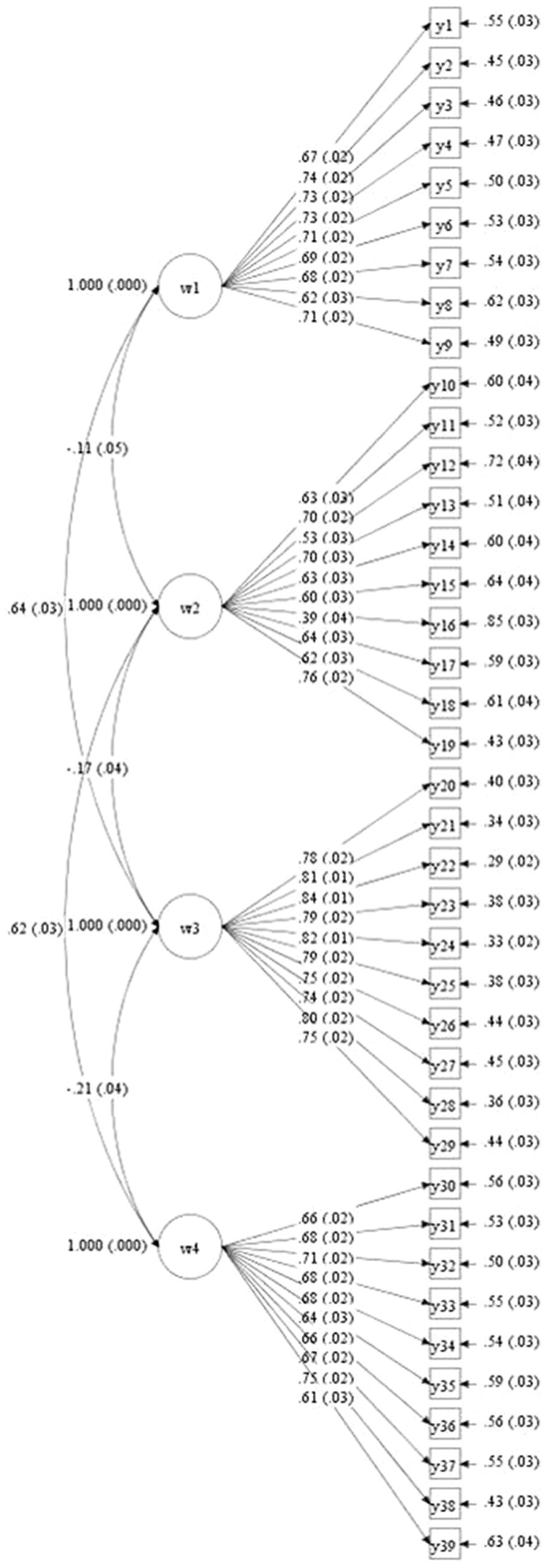 The present study used a project differentiation analysis to check whether scale items were adequate. Total correlations and critical ratios (critical point at 27%) among items were used as analytical indices for item discrimination. Results from Sample 1 (Table 2) revealed that the correlation coefficients between the 39 PBGECS items ranged from 0.69 to 0.85, which indicates satisfactory item discrimination.