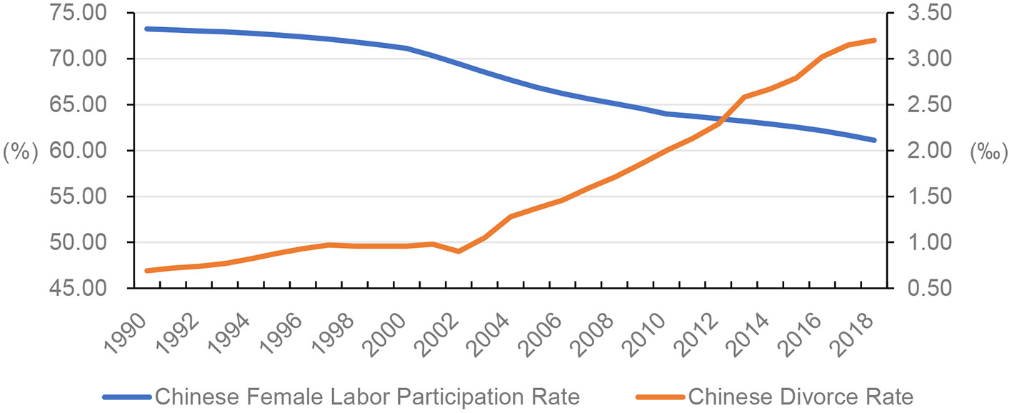 Chinese female labor participation rate (%) and Chinese crude divorce rate (%0), 1990–2018. Female labor force participation rate is the proportion of the female population aged 15 years and older that is economically active and modeled based on ILO estimate. Chinese crude divorce rate is the number of divorces per 1,000 people in China. Sources: World Bank. (2020) and China Social Statistic Yearbook of 2019. (2020).