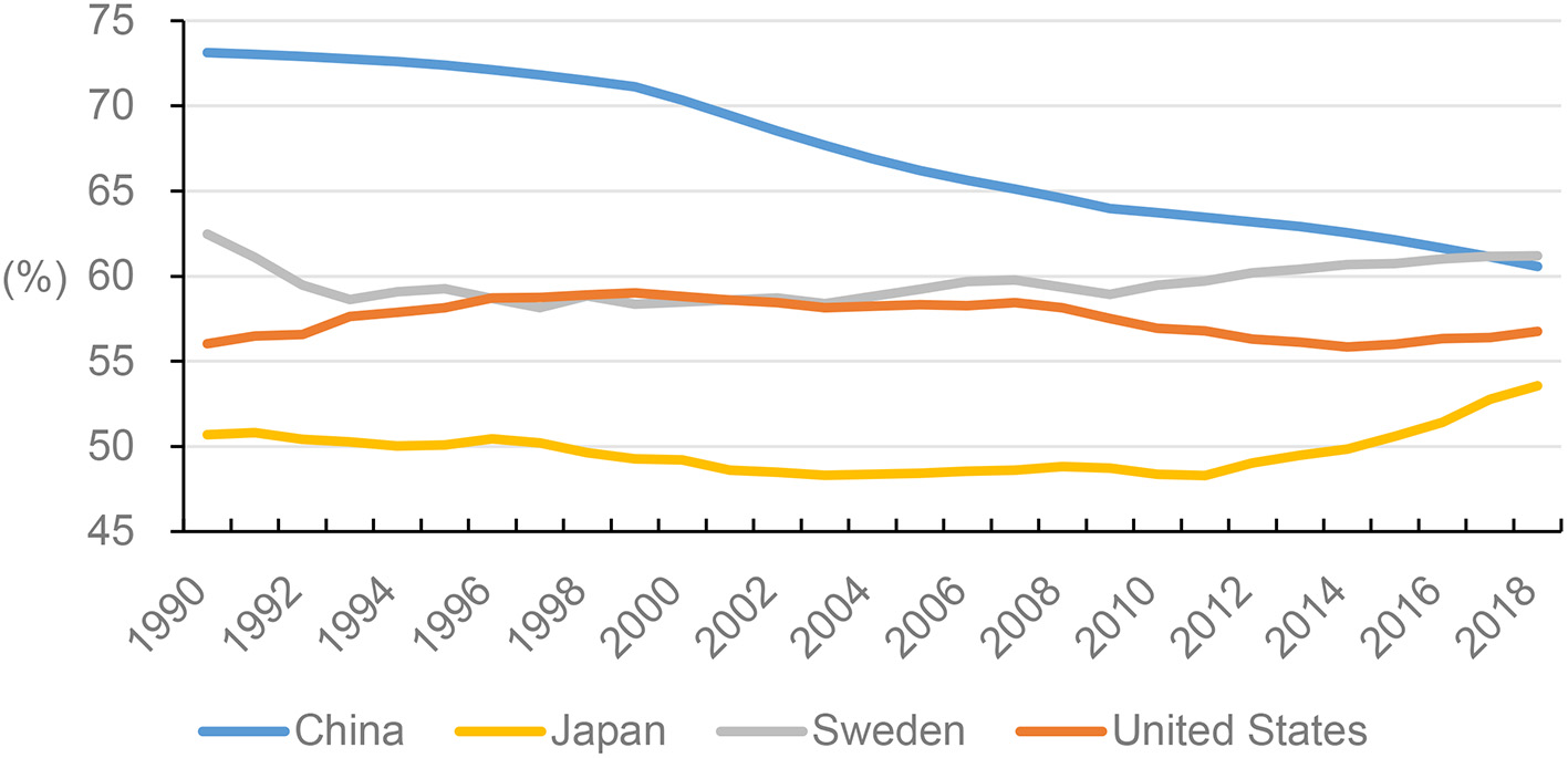 Female labor participation rate (%) among China, the US, Sweden, and Japan, 1990–2018. Female labor force participation rate is the proportion of the female population aged 15 years and older that is economically active and modeled based on ILO estimate. Sources: World Bank. (2020).