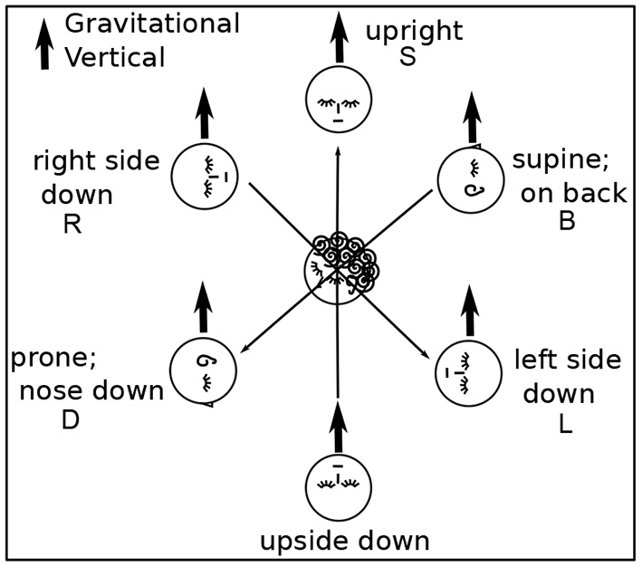 Head Positions with Respect to Gravity. Gravity can be aligned with three axes through the head, in two directions along each axis. Participants assumed each position except upside down. Positions are denoted B, R, L, D, and S.