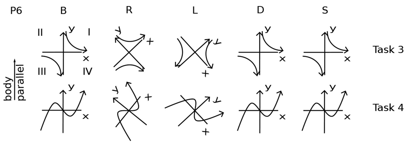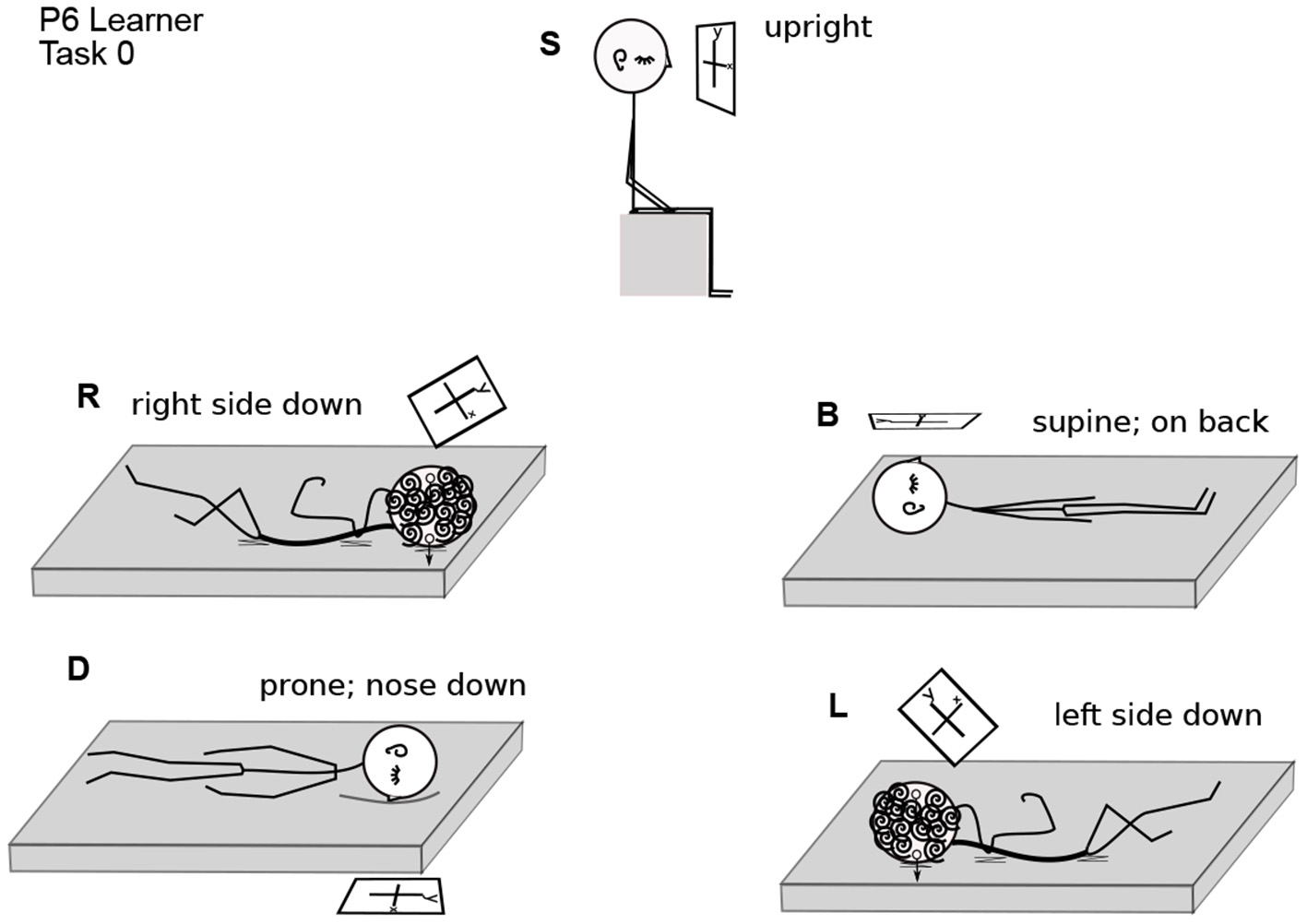 Participant 6 Performing Task 0. Body positions are arranged as in Figure 1. The coordinate plane is drawn in a rectangle, as if on a piece of paper, to make its orientation clearer. In position S, P6 is upright in gravity. The coordinate plane imagery is in front of the face, gravitationally vertical and parallel to the frontal (also called lateral) plane of the body. In R, the right ear is down. The coordinate plane imagery is in front of the face, with the y-axis on a diagonal between body-parallel and gravitationally vertical. In B, the nose is pointing up in gravity. The coordinate plane is in a horizontal plane with respect to gravity, in front of the face, with the y-axis parallel to the body axis. In D, the nose is down. The coordinate plane is horizontal, parallel to the floor, and the y-axis is body-parallel. In L, the left ear is down. The coordinate plane is in front of the face, with the y-axis on a diagonal between body-parallel and gravitationally vertical.
