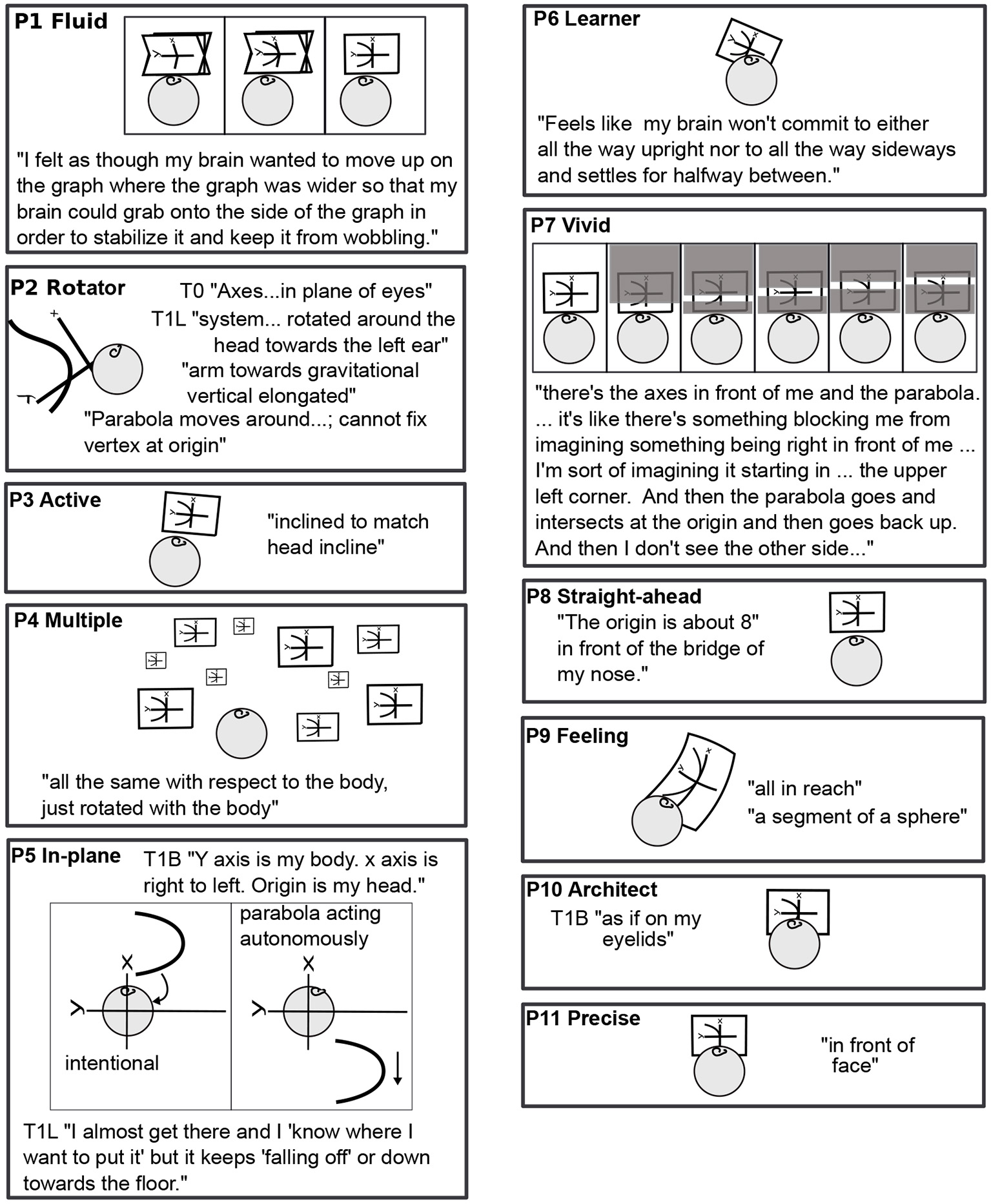 Task 1 L drawn for all participants: Variety. Sequential drawings (P1, P5, and P7) read left to right, like a comic strip. The right ear up shows that the participant is lying on the left side. P2's head is rotated in backward pitch to show the position of the plane (see Figure 4, lower right corner, for pitch, roll, and yaw rotations). Quotes are taken from other body positions (P5, P10) when it is clear from context that they apply to T1L.