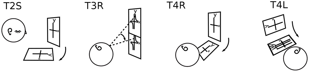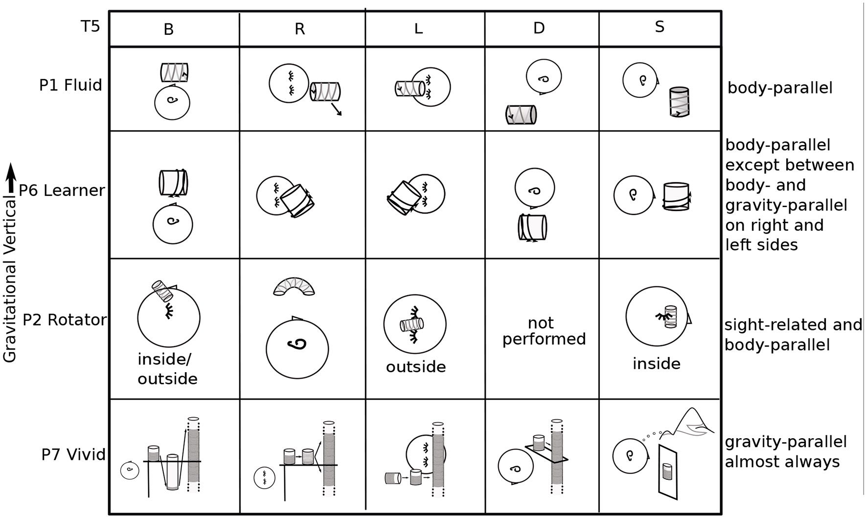 | P2 Rotator | body-parallel with various rolls and drifts; yaw in T1L | T0-4 on eyelids; T5,6 just in front of eyes, on nose, and inside head |