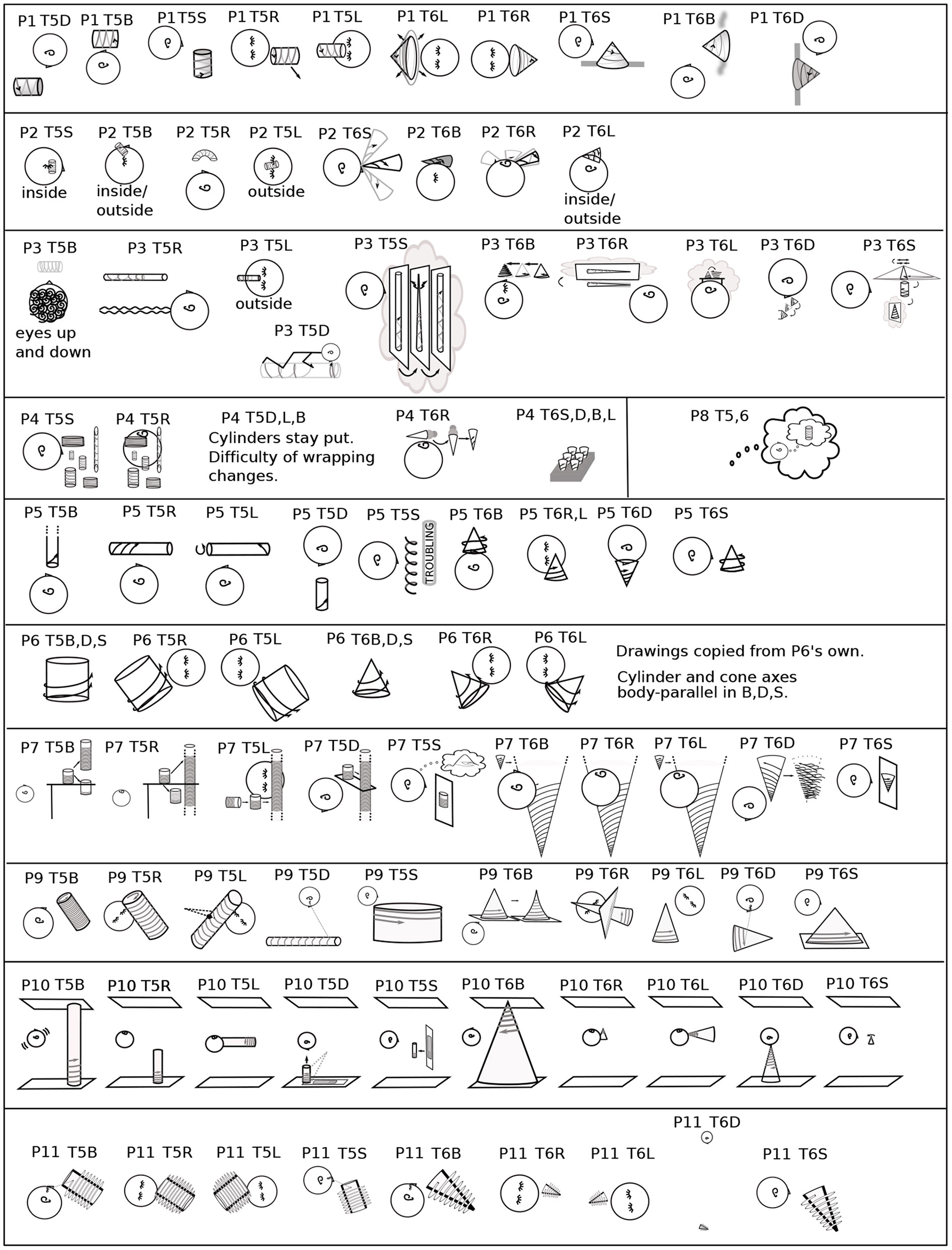 | P10 Architect | S,B,D b, T0-4; R,L T0 horizontal; Lb T1-3; Lg T4; Rg T1-4; T5,6 gravitational vertical except T5D two perspectives 3.5 | T0B, T1B,R,L on eyelids T0R,L on ceiling; T0-6D on floor: T0,1S, T2-4B,R,S, T2,4L, T5L,S, T6R.L,S paper distance; T3L on wall; T5 B,R,D, T6B rising from ground |