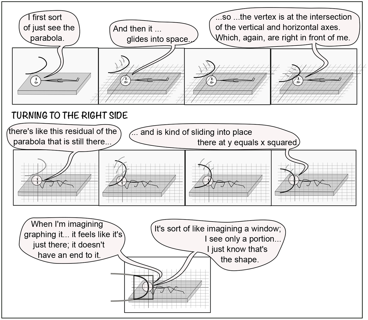 Components or layers in P7T1B,R. Top row, left to right: P7's sequence of visualizations in T1B, along with P7's verbal description. Drawings are from P7's verbal account, including the context from previous tasks. P7 typically graphed on a grid, rather than axes. The second row begins with P7 turning to the right side, with the parabola remaining in place. The parabola rotates in yaw and slides into place on the grid. The third row shows P7's further description.