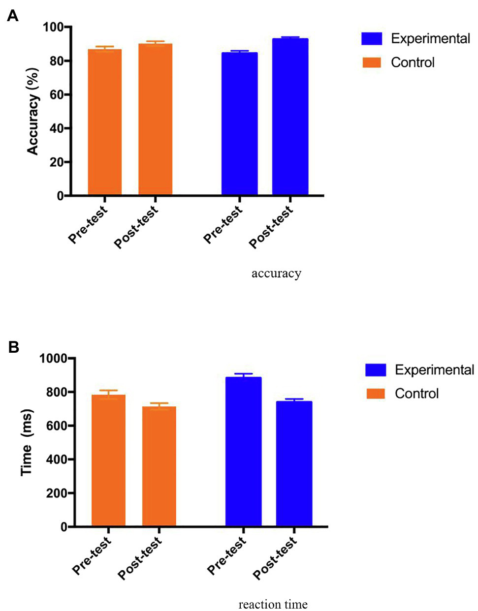 The working memory performance was assessed in terms of accuracy and reaction time. For the accuracy score, the Mixed ANOVA results show no main effect of group [F (1, 69)=0.00, p=0.99, ηp2=0.000], but the effect of test time was significant [F (1, 69)=29.88, p=0.00, ηp2=0.30]. Furthermore, there was significant interaction effect of group and test time [F (1, 69)=5.59, p=0.02<0.05, ηp2=0.075]. As shown in Figure 5A, the post hoc analysis indicates that the accuracy score in the control group was improved significantly from pre-test [Adjusted Mean (SE)=86.79 (1.55)] to post-test [Adjusted Mean (SE)=90.10 (1.40); p=0.03<0.05], and the accuracy score in the experimental group was also improved significantly from pre-test [Adjusted Mean (SE)=84.26 (1.52)] to post-test [Adjusted Mean (SE)=92.59 (1.38); p=0.000<0.001], with a medium effects size (Cohen’s ƒ=0.28). While both groups improved the accuracy score, the experimental group improved significantly more than the control group.