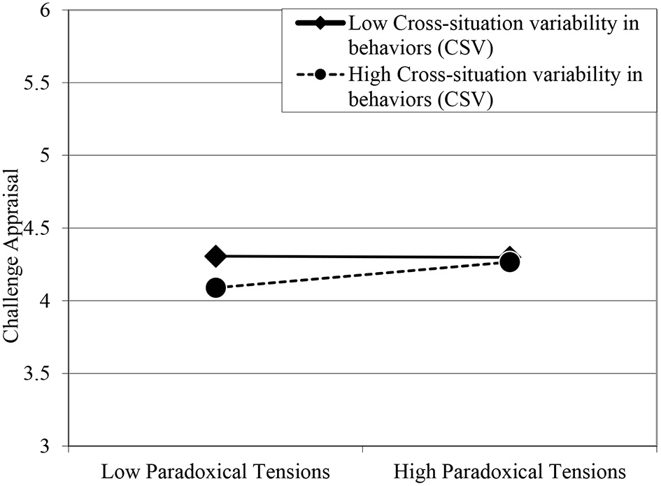 Moderating effect of cross-situation variability in behaviors (CSV) on the relationship between paradoxical tensions and challenge appraisal.