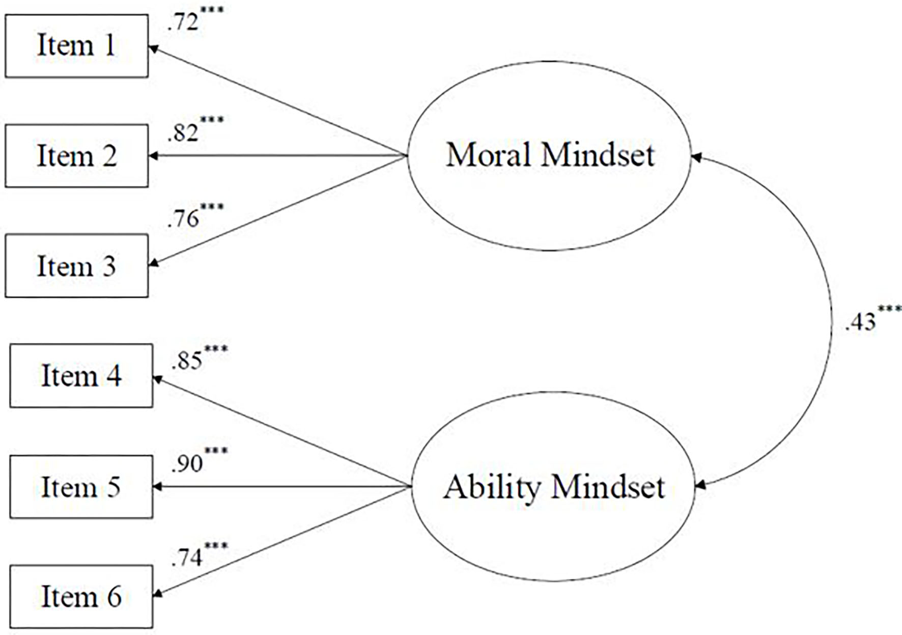 Confirmatory factor analysis of mindset. N = 599. Standardized values used. Model fit, χ2 (8) = 24.89, p < 0.01, CFI = 0.99, TLI = 0.98, RMSEA = 0.06, and SRMR = 0.03. ***p < 0.001.