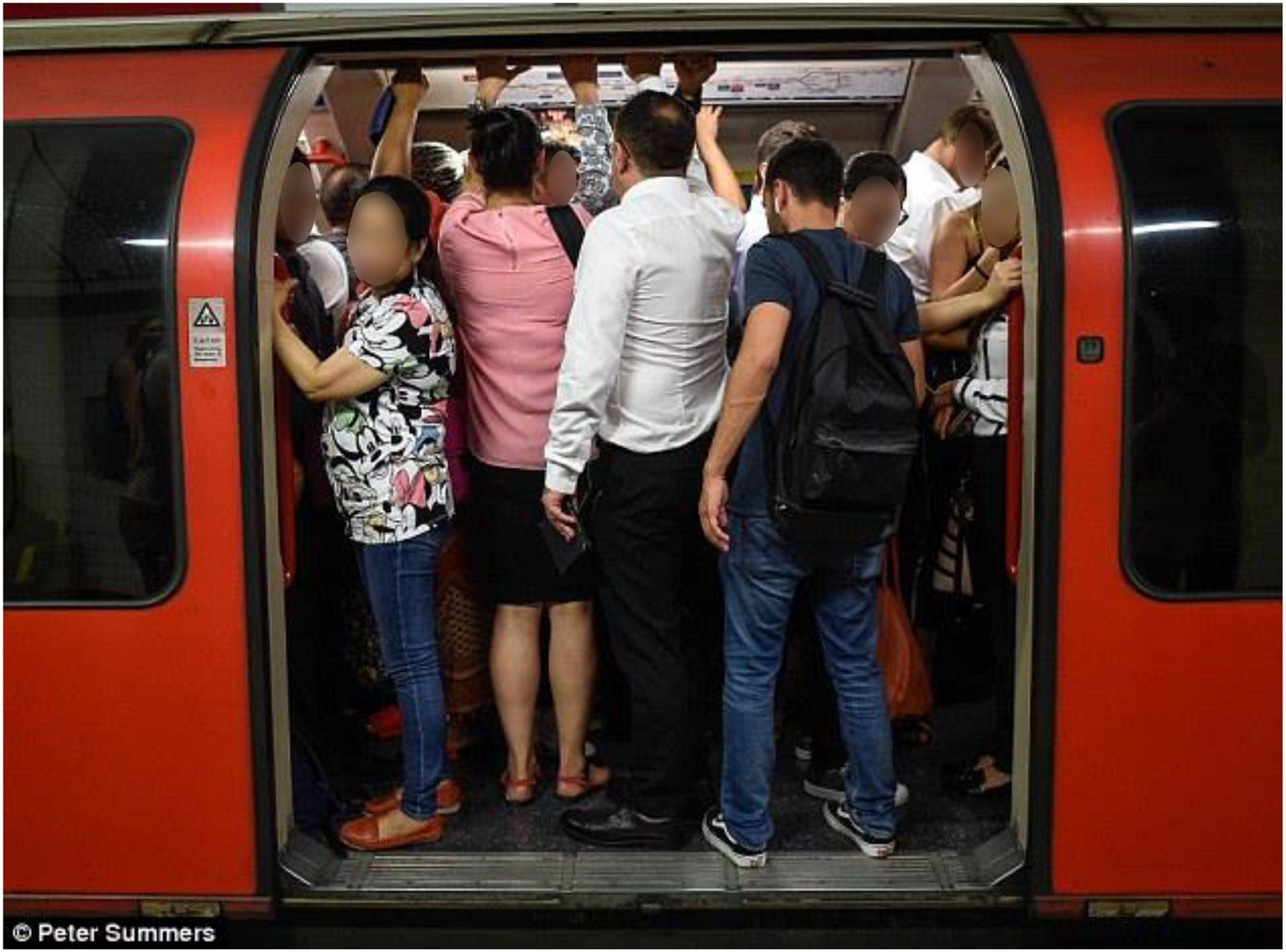 Crowding is also often more likely to be a problem on public transport than is typically the case in the built environment (as highlighted by people's oft-discussed dislike of sitting in the middle seat on the train: McGeeham, 2005; Evans and Wener, 2007)7. Interpersonal space is much lower still when it comes to those passengers who are forced to travel in the confined space of mass transportation (be it Mass Transit or the London Tube) at rush hour that pretty much anywhere else (cf. Dipodjoyo, 2019). Is there any other situation, one might ask, where one's personal space is so radically compromised (see Figure 1)? Combined with the often high temperatures (Thompson, 2014)8 and lack of natural ventilation, this invasion of the passenger's personal space (Sommer, 1959, 1969; Horowitz et al., 1964; Felipe and Sommer, 1966; Dosey and Meisels, 1969; Kennedy et al., 2009) in the London Tube, but also on other forms of public transport, can soon lead to an awareness of other people's body odors that most of us would rather do without. The overpowering odors can be especially noticeable in the summertime when it can get very hot down there (according to one press report concerning the London Underground, in the summer it is sometimes above the legal temperature for transporting livestock; see Thompson, 2014). The reduced personal space brings the passenger much closer to the smell of unknown others than is typically the case elsewhere in our daily lives. What is more, this is typically found to be an unpleasant experience with those other unknown passengers of other races and/or social classes often suggested to have a distinctive, and frequently disliked, scent (e.g., Orwell, 1937; Largey and Watson, 1972; Classen, 1992; Manalansan, 2006; Bever, 2019)9.