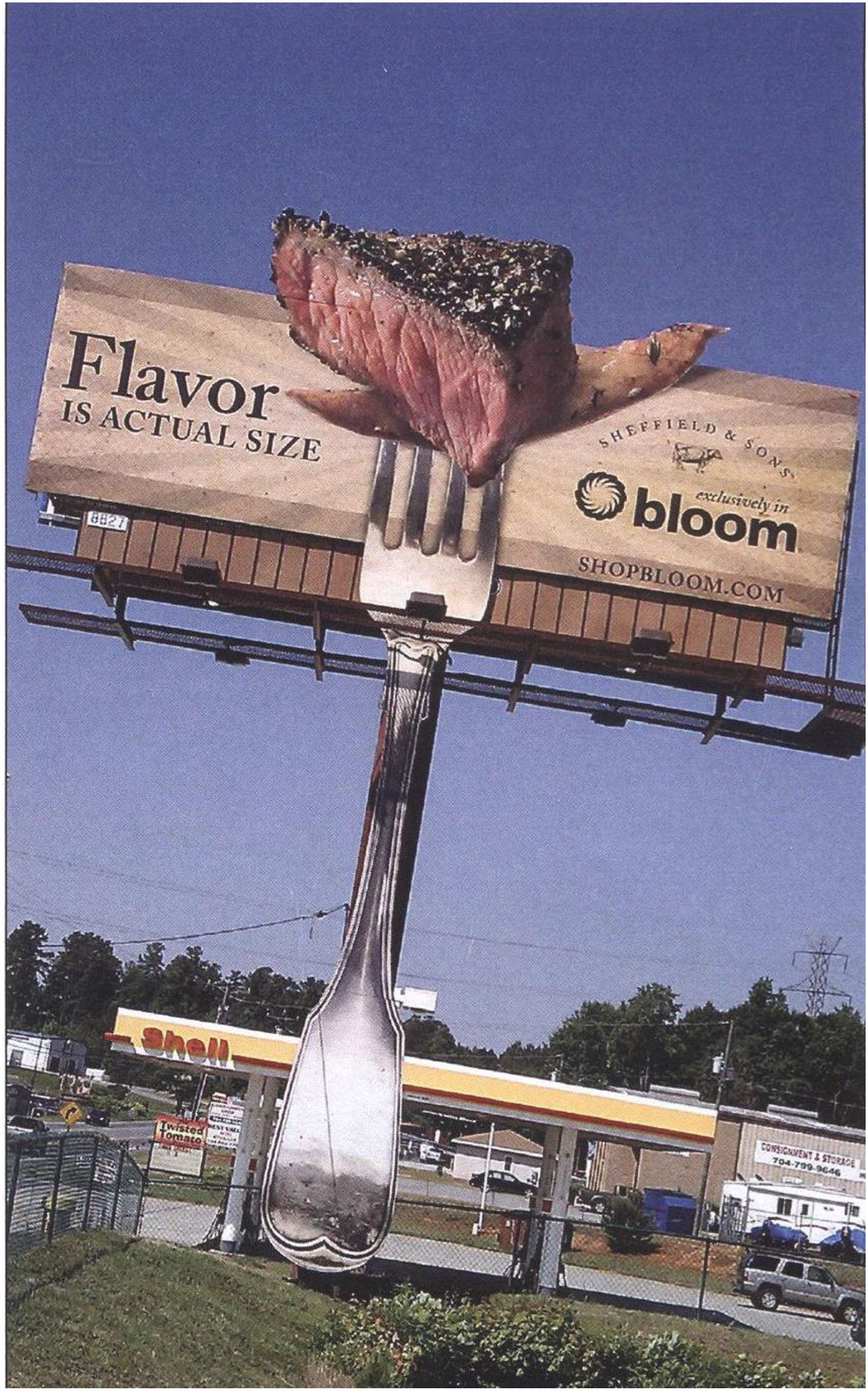 In 2010, on Highway 150 in Moorseville, North Carolina, USA, a huge billboard for Bloom, a division of Food Lion, a grocery store displayed a piece of steak on a fork (see Figure 2). The ScentAir company created a scent that smells of black pepper and BBQ that was pumped out to passing motorists by means of a large fan positioned at its base that blew over a number of BBQ fragrance oil cartridges. The scent was dispersed in the mornings and afternoons when commuter traffic was likely to be at its peak. One bemused motorist described it thus: “It smells like, uh, barbecue, like hickory or something being barbecued and smells like steak.” (Aronoff, 2010).