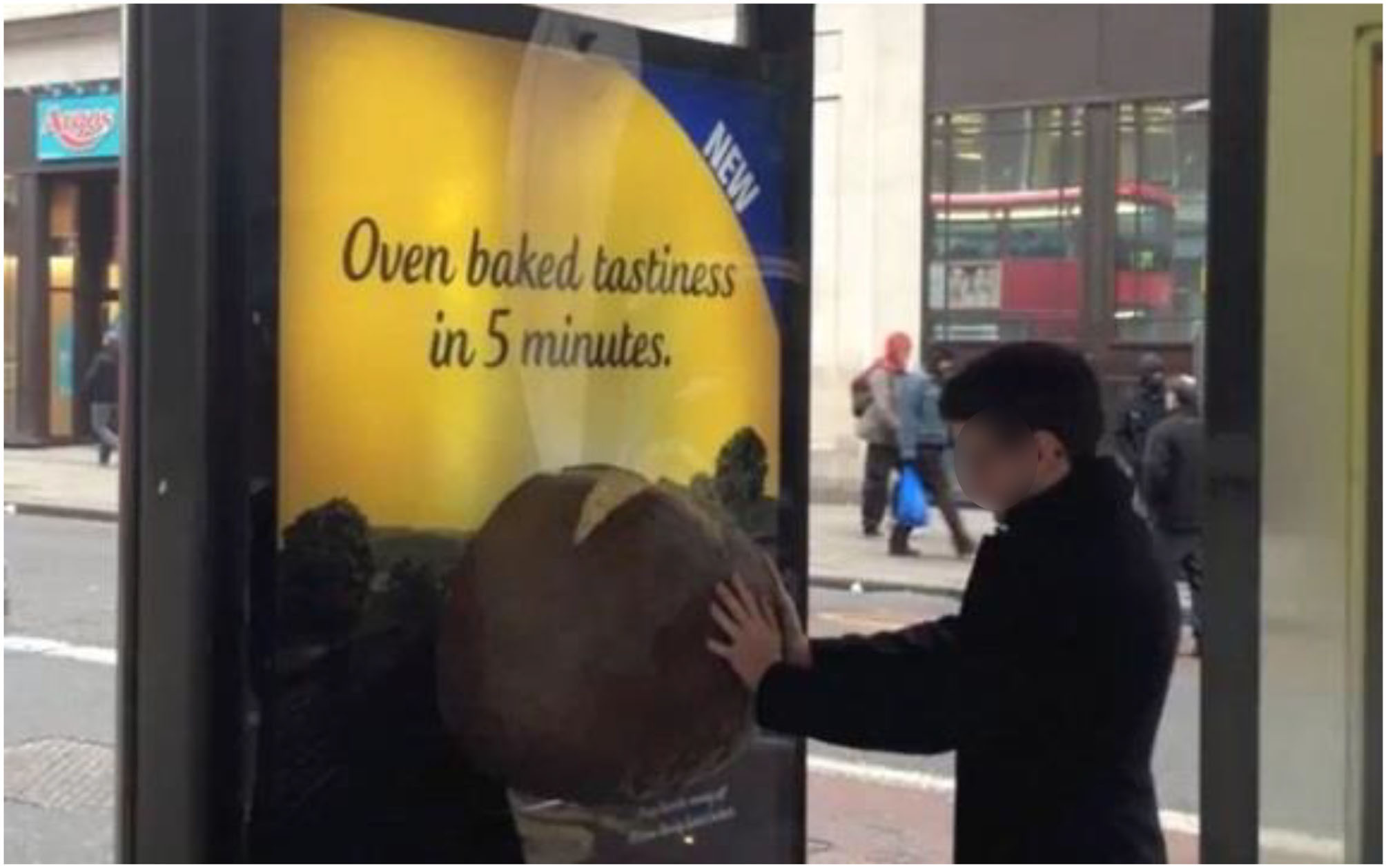 In 2013, I was involved in an olfactory marketing campaign with a London-based marketing agency. The campaign involved a specially-modified London taxi (a black cab) being sent out around the capital's streets pumping-out the smell of McCain's Ready Baked Jackets, basically microwavable oven-baked potatoes (Anon, 2013). At the same time, a few 3D video signs were erected at a number of bus stops. The idea was that curious commuters who chose to push the button on the baked potato were surprised when a pleasant baked potato aroma was released (see Figure 3). In the words of one commentator: “Each billboard includes a fiberglass potato sculpture and a mysterious button: Push it, and the tuber discharges the aroma of “slow oven-baked jacket potatoes.”