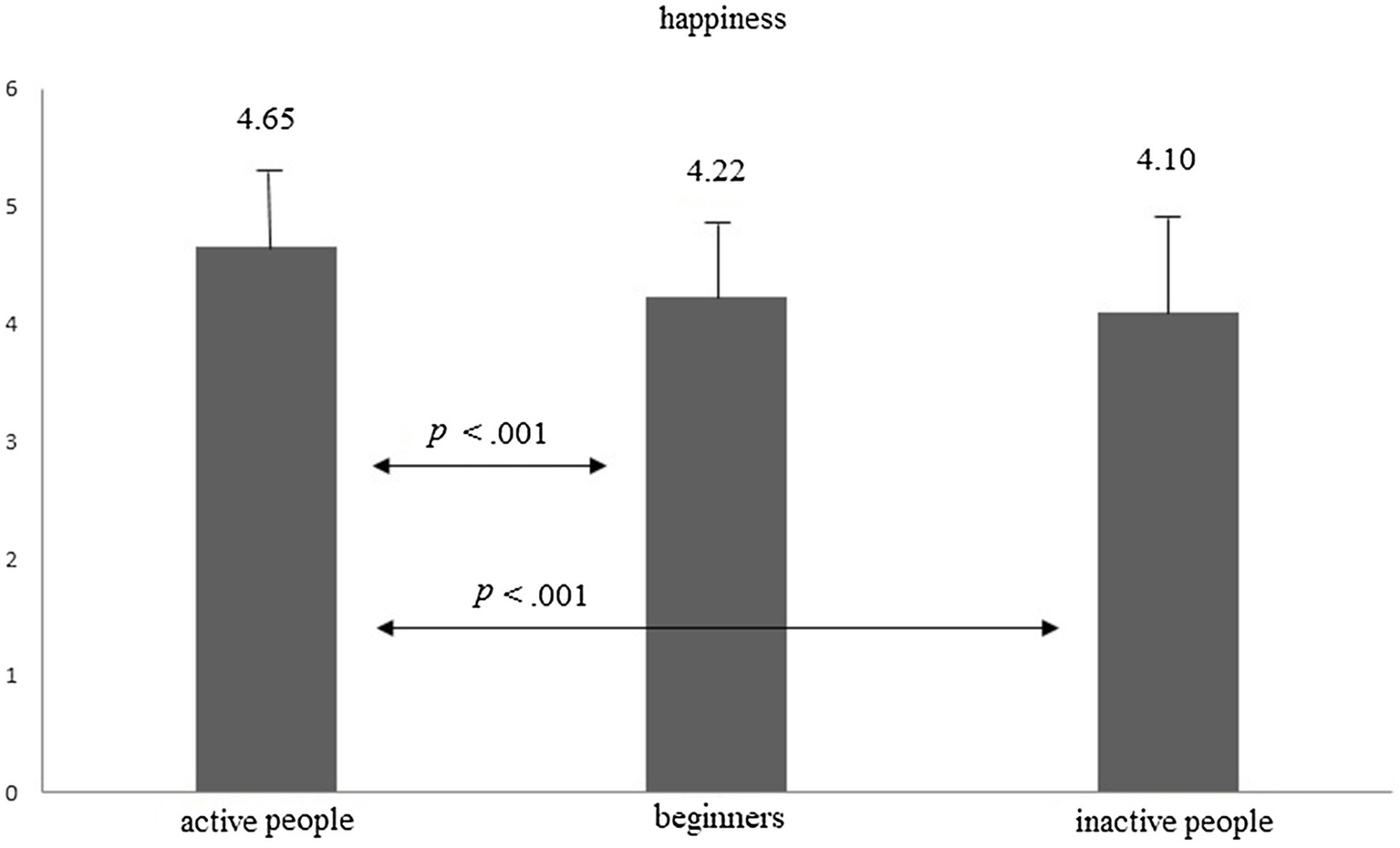 In order to compare the level of happiness, a one-way ANOVA was performed. The analysis showed that in the first measurement the groups significantly differed in their levels of happiness: F(2, 214) = 15.59, p < 0.001, eta = 0.127. The data are presented in Figure 1. Bonferroni’s post hoc tests indicated that active people presented a significantly higher happiness level than beginners and inactive people (p < 0.001). Hypothesis 1 was thus confirmed.