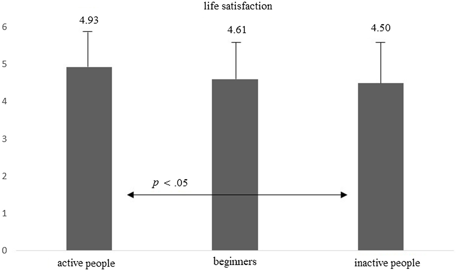 Figure 2. Average level of life satisfaction in groups of active people, beginners, and inactive people.