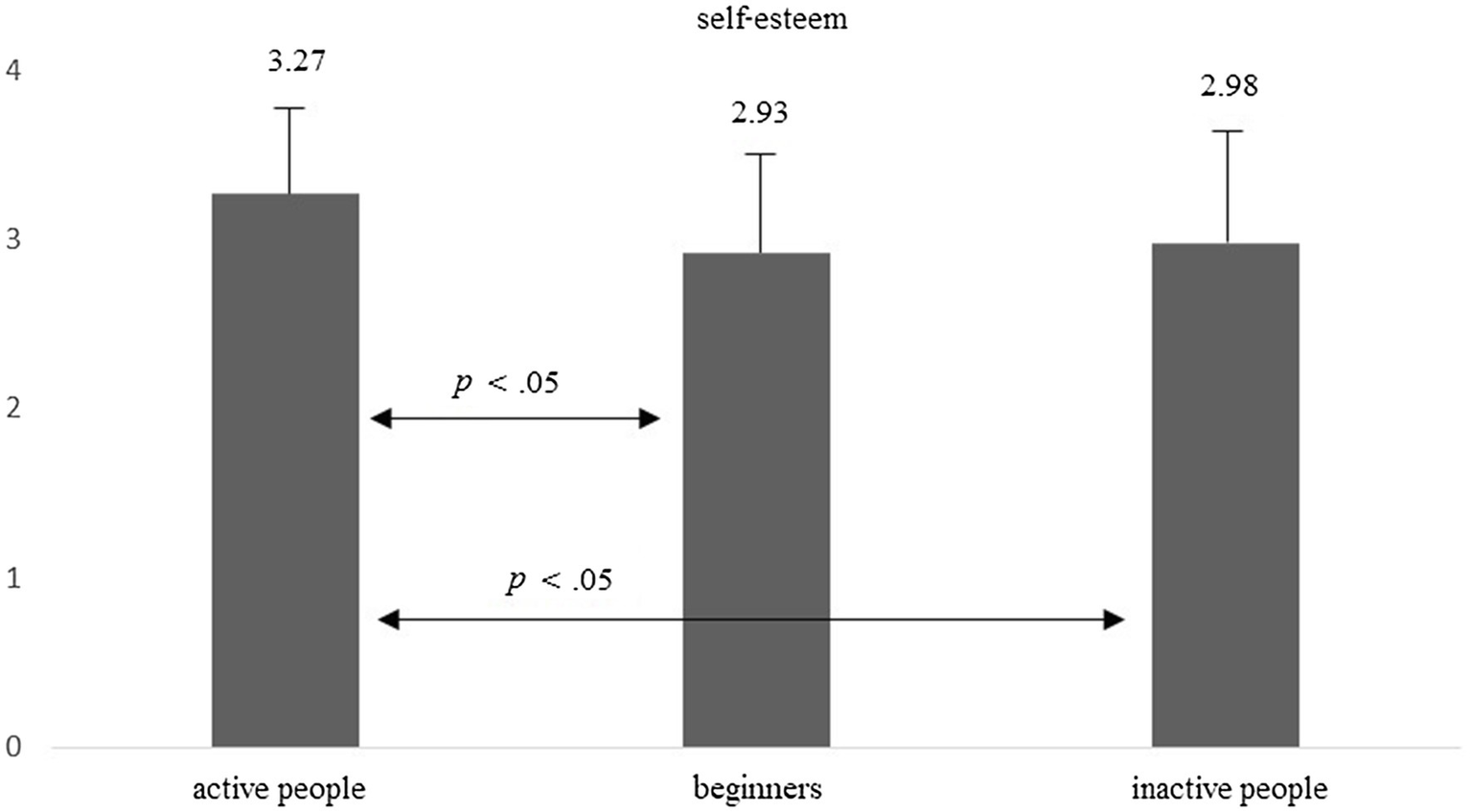 Differences were also observed for the level of self-esteem: F(2, 214) = 7.36, p = 0.001, eta = 0.064. Active people presented a significantly higher level of self-esteem at the first measurement than beginners and inactive people (Bonferroni’s post hoc test, p < 0.05). The data are presented in Figure 3. Thus, Hypothesis 3 was confirmed.