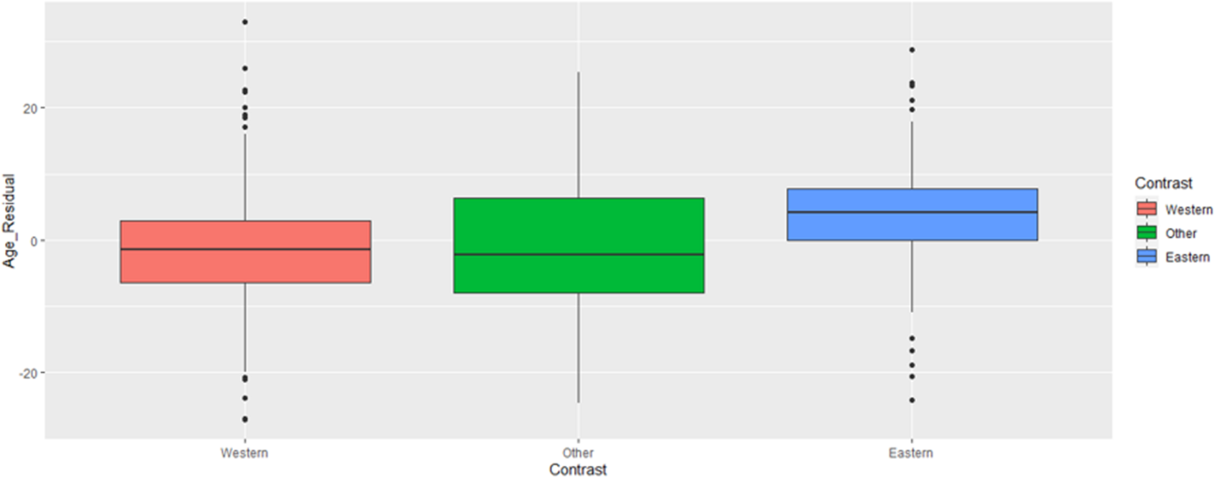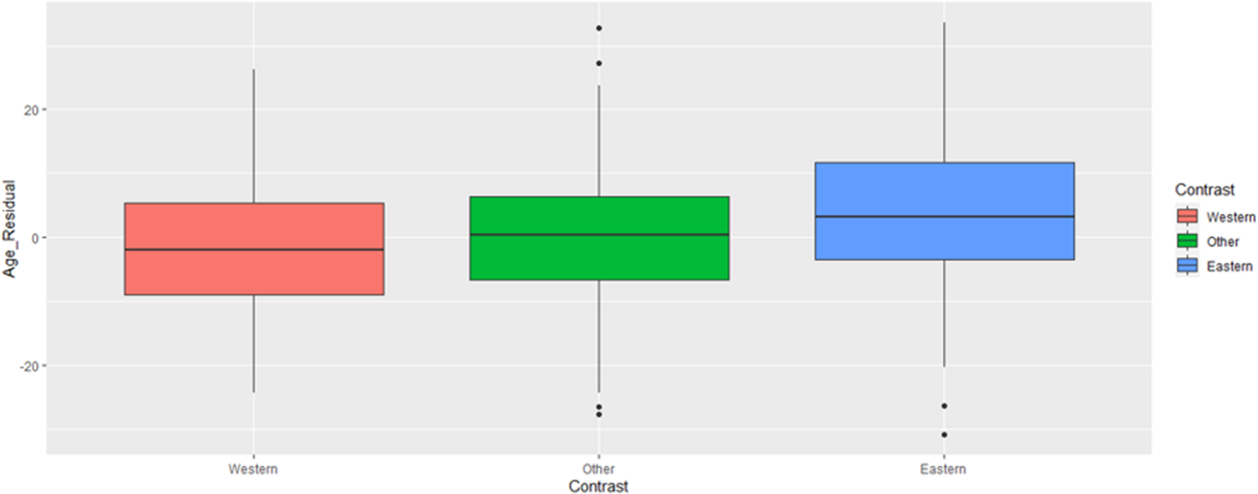 Following the preregistration, we checked for mediation using Hayes’s (2017) PROCESS Model 4, and the indirect effect was non-significant, IE = 0.35 [−1.21, 1.92]. Importantly, the a-path from culture contrast to cultural tightness was significantly positive, B = 33.58 [31.60, 35.57], t(748) = 33.20, p < 0.00018. Indeed, this effect indicates that Eastern cultures were culturally tighter than Western ones, consistent with our theorizing. However, the b-path between cultural tightness and leader age was non-significant, B = 0.01 [−0.02, 0.05], t(747) = 0.46, p = 0.647.