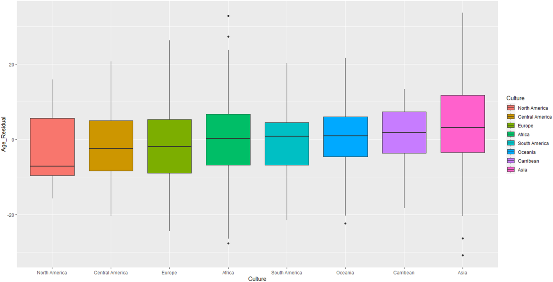 Figure 1. Business leader ages by geographical region. Age depicted in the figure is adjusted for the presence of the economic and elderly population covariates. See SOM for figures presenting raw (i.e., unadjusted by covariate) age scores.