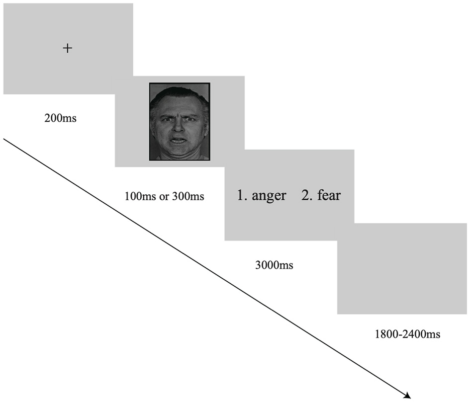 In each trial, a fixation was initially presented for 200 ms, followed by a facial expression image on the screen for 100 or 300 ms. Participants were required to identify the emotion from the presented image and to respond by performing a 2AFC task. Specifically, they needed to choose “1” or “2” (e.g., 1 = anger and 2 = fear) by pressing the corresponding key as quickly and accurately as possible. The interstimulus interval (ISI) randomly ranged from 1,800 ms to 2,400 ms (Figure 1). The whole study consisted of 15 blocks, and each of which had 20 trials. The trials of two different facial expressions were equally presented in each block. Moreover, the sequence of blocks was random, and the presentation of emotional stimuli was also in random order. There were four practice trials before the formal experiment.