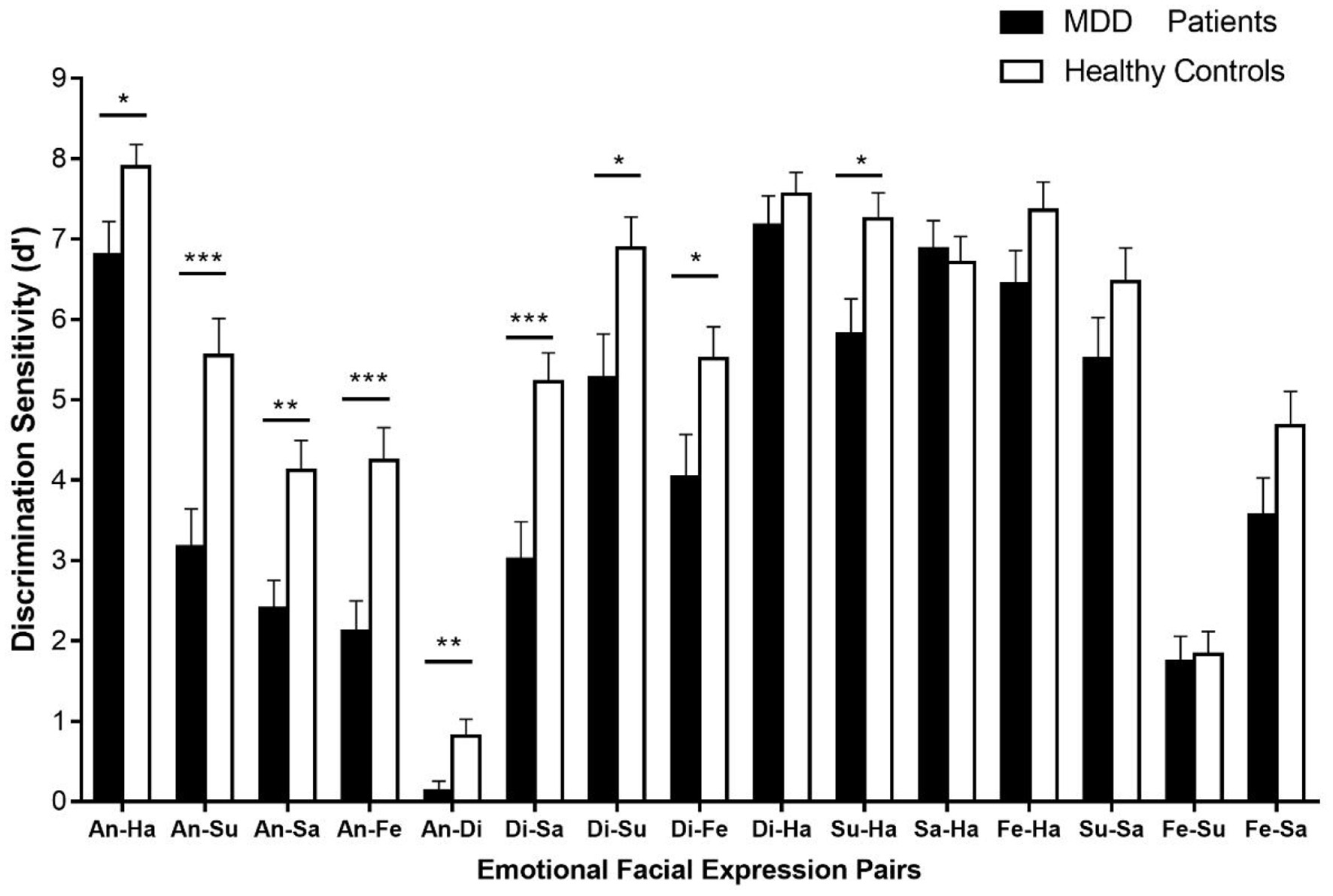 The discrimination sensitivities (d′) for 15 emotional facial expression pairs. Error bars represent SEMs. Di, disgust; An, anger; Fe, fear; Su, surprise; Sa, sadness; Ha, happiness. *p < 0.05; **p < 0.01; ***p < 0.001.