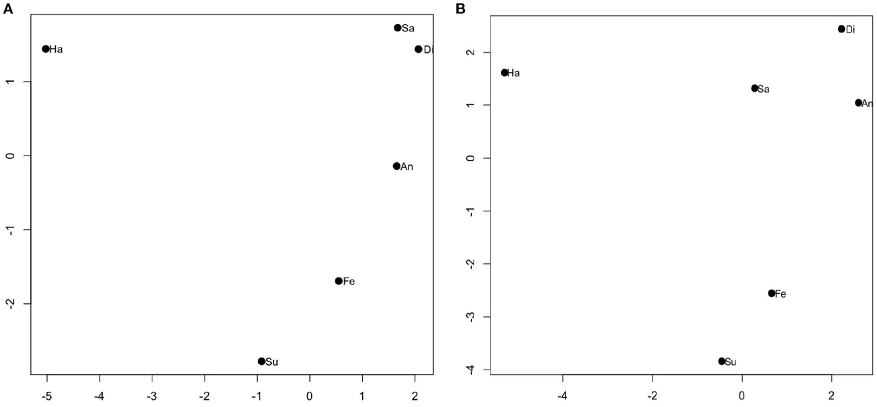 The multidimensional scaling (MDS) solution, based on the discrimination sensitivity (d′) values. The horizontal and vertical coordinates have no special meaning, while the period between the two emotions reflected the discrimination sensitivity value. Di, disgust; An, anger; Fe, fear; Su, surprise; Sa, sadness; Ha, happiness. (A) The discrimination sensitivity values for major depressive disorder (MDD) patients and (B) the discrimination sensitivity values for healthy controls.