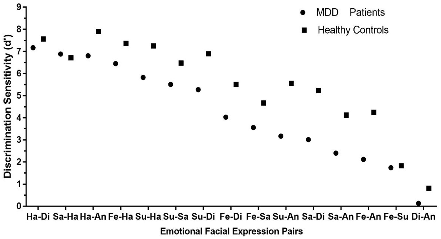 The Spearman's correlation revealed a strong correlation of the discrimination sensitivity between patients with MDD and healthy controls, r = 0.929, p < 0.01, indicating that patients with MDD and healthy controls showed a similar pattern in discriminating different facial expression pairs. Figure 5 shows the scatter diagram of discrimination sensitivities (d′) of 15 emotional facial expression pairs in patients with MDD and healthy controls.