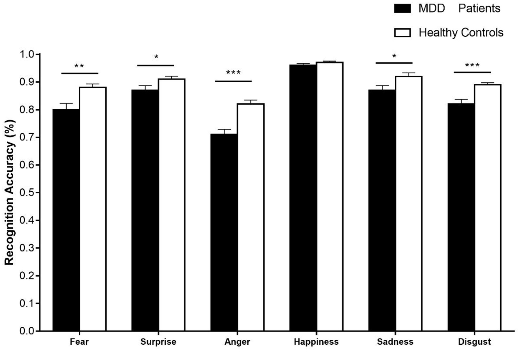 The recognition accuracies of six basic emotional expressions in patients with MDD and healthy controls. Error bars represent SEMs. *p < 0.05; **p < 0.01; ***p < 0.001.