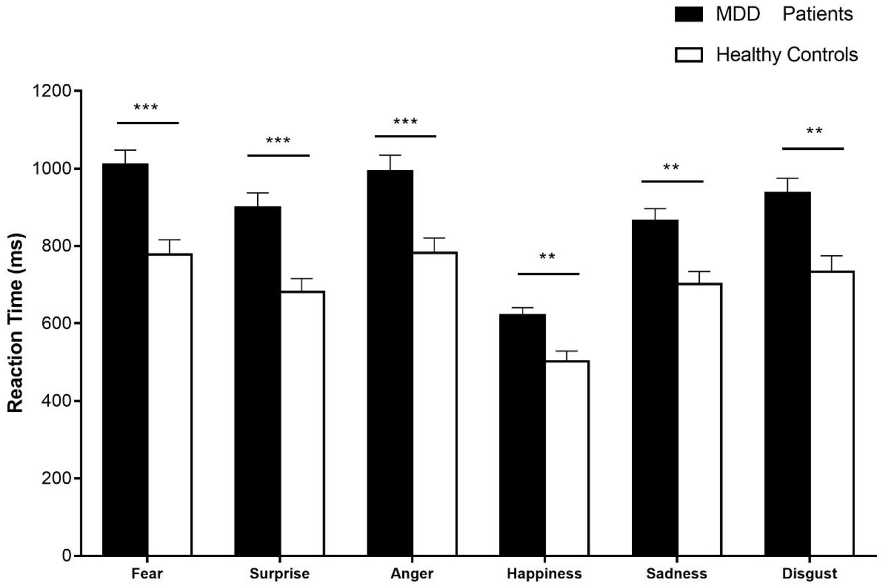 The reaction time of six basic emotional expressions in patients with MDD and healthy controls. Error bars represent SEMs. *p < 0.05; **p < 0.01; ***p < 0.001.