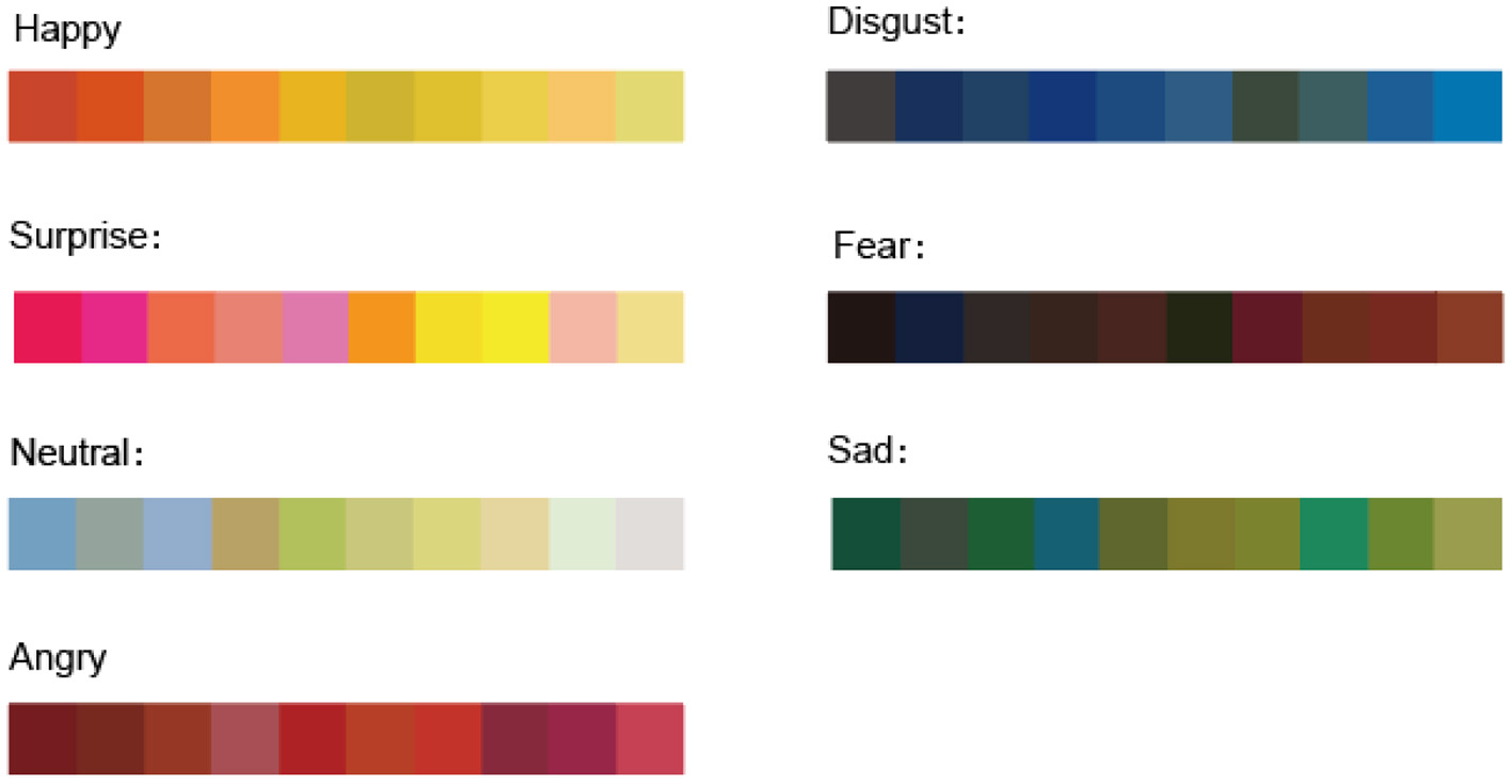 The main purpose of the “transformation” session is to form an emotional palette that is accurate to the individual user based on data extracted from facial emotional characteristics to facilitate the replacement of the original color of the art in the next steps. Taking Van Gogh as an example, this study classifies colors as emotional symbols by reference to the research of symbolism and psychology of colors, focusing on Van Gogh (Cela-Conde et al., 2010). In color habits of Van Gogh, yellow or orange colors represent positive and happy; saturated yellows and peaches represent surprise and joy; light colors with lower saturation, such as sky blue, pale green, and goose yellow, represent calm and leisure; red represents anxiety and anger; heavy green or blue green represents despair and sadness; blue represents a conflict between disgust and inner desire; and black and crimson represent depression and fear. According to the above color law, each type of facial emotion will be extracted to correspond to the color system of related emotion expression. Each color system has 10 colors, and finally, a complete type of facial emotion to color mapping will be constructed. After constructing the relationship between emotion data and color mapping, the individual emotion data are matched with the specific color by an algorithm, and the emotional palette is formed accurately to the individual to ensure the diversity and richness of the emotional palette. The emotional palette is shown in Figure 3.