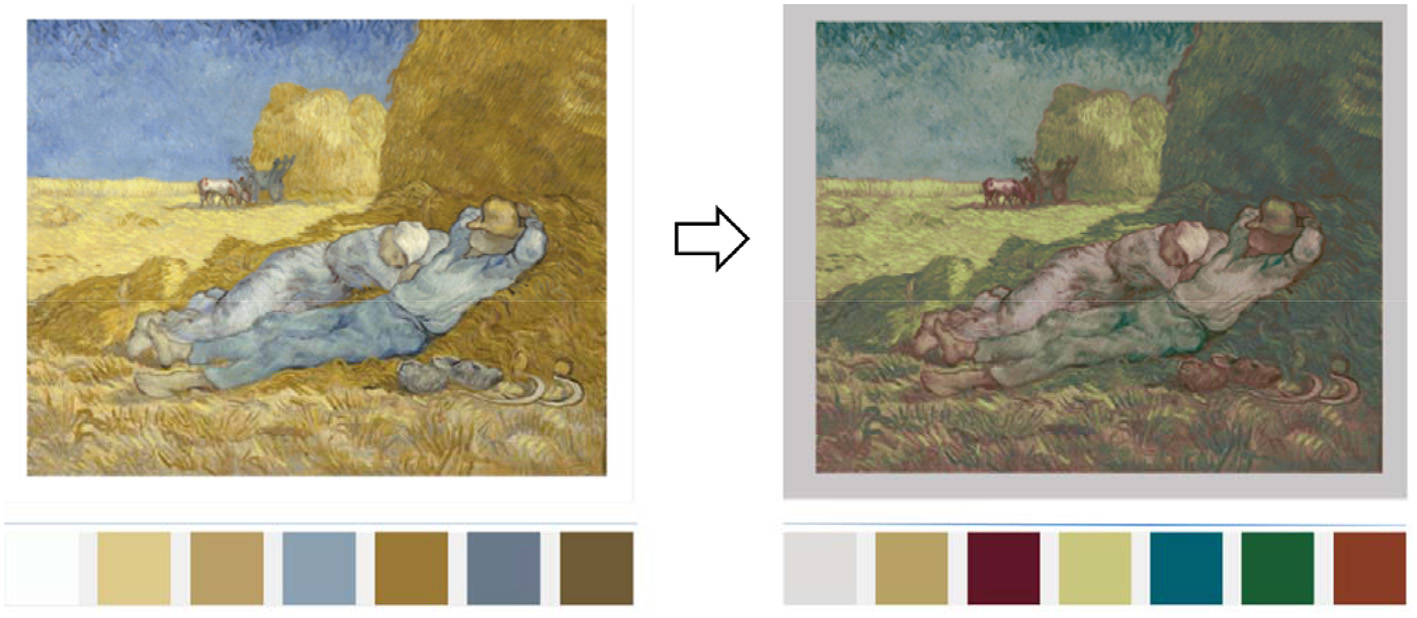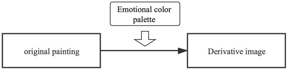 The main purpose of implantation is to automatically replace the color of the original painting with an emotional palette and to preserve the main features of the original painting, as shown in Figures 4, 5. To date, many scholars have worked out ways to recolor the image, such as Li et al. (2015), who used geodesic line spacing to complete the recoloring of the image while ensuring color coordination throughout the image in 2015. In the same year, Chang et al. (2015) proposed an interactive color replacement system based on palettes that can visualize images, and Cho et al. (2017) trained PaletteNet using a framework of deep neural networks, dramatically reducing the time to recolor in 2017. Replacing the color of the original painting with an emotional palette that is accurate to the individual user and using the “color” in the derived image as a personalized variable manipulated by the emotional characteristics of different users can realize the differentiated design of thousands of people and establish the emotional connection between the derived image and the user.
