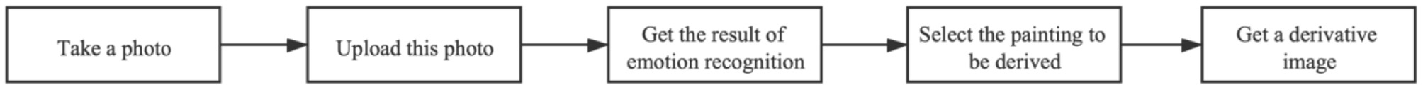 Based on paintings of Van Gogh, this study combines the traditional method with deep learning to construct a complete personalized derivative image design system, which is driven by emotion analysis for simulation testing, to verify the feasibility of the new method. The system is divided into three main modules, namely, the facial emotional feature extraction module, the emotional palette generation module, and the original color replacement module. The actions of the user are as follows: first, the user needs to make an expression in front of a camera to shoot. Then, from the images provided to the user by the system, the user selects the original painting that will be derived. Finally, the system changes the color of the original image by emotional analysis and image processing and generates the corresponding image derivatives, as shown in Figure 6. Correspondingly, the operating process of the system is as follows: first, the system reads the photos taken by the camera and passes them into the facial emotional feature extraction module to finish the transformation of facial emotional characteristics into computer data; then, the extracted data are fed into the emotional palette generation module to create a corresponding emotional palette, and finally, the emotional palette is entered into the color replacement module to replace the original color, as shown in Figure 7.