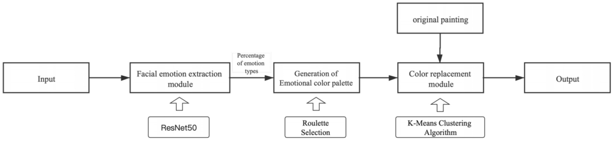 There are also some problems that can be improved. The facial emotion feature extraction module mainly uses ResNet50 to extract the facial emotion data of the user. Its shortcomings are that the accuracy of this module is not high enough and extracting emotion data from video and processing them cannot be achieved; the emotion color palette generation module uses roulette wheel selection to realize the generation of emotional palettes, but its disadvantage is that the color matching of the generated palettes cannot fully meet the aesthetic standards. The original color replacement module uses the K-means clustering algorithm to achieve the color replacement of the original image based on the emotional palette. The disadvantage is that it cannot completely retain the beauty of the light and dark levels of the original color.