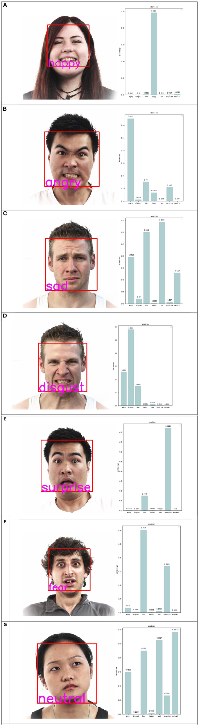 A derivative picture of (A) happy, (B) sad, (C) angry, (D) surprise, (E) disgust, (F) fear, and (G) neutral. Facial images are from the public dataset fer2013, which can be downloaded at https://www.kaggle.com/deadskull7/fer2013.