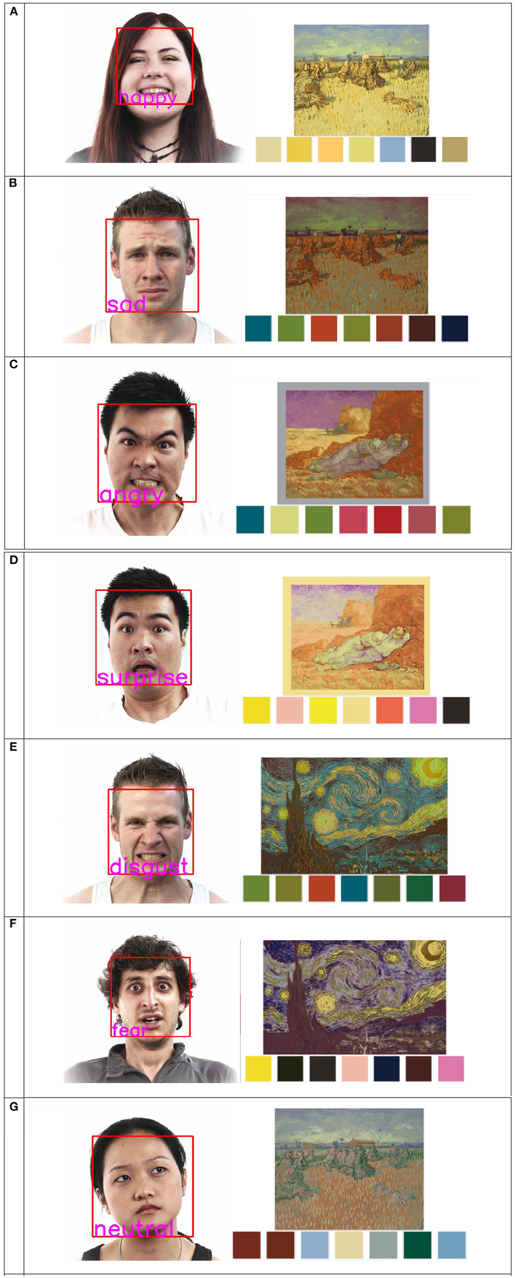 The purpose of the color replacement module is to replace the original palette with the emotional palette to complete the color transformation of the original image. As the modules are built, this study refers to the project of the team of Kanyaraasi, Palette-based Photo Recolor (Chang et al., 2015), to build the color replacement system. The image recoloring system proposed by the Kanyaraasi team has a complete image recoloring interface that allows users to replace the color of palettes one by one by mouse interaction, depending on their personal preferences. Based on this system, this study proposes an image recoloring system driven by an emotional palette corresponding to facial emotional characteristics, which realizes the full automation of the process. The color transformation system is based on the K-means clustering algorithm, which extracts the palette of the original painting and realizes the color transformation processing of the image. To improve the clustering efficiency of the K-means algorithm, first, the three channels of the image RGB are normalized, and then, based on the statistical results of the image histogram, the channels are divided into 16 sets of histogram columns. Each histogram column contains several pixels, and then 16 × 16 × 16 statistical histogram columns can be obtained. The Lab spatial color mean of the pixels in each statistical hist bar is calculated as the cluster color center of each statistical hist square bar, and then, the 16 × 16 × 16 cluster color centers are clustered using the K-means clustering algorithm. The cluster center is divided into seven categories. The color of each cluster center is a kind of palette, and then, the original image of seven palettes is extracted. Then, with the emotional swatch proposed above, according to a specific method of one-to-one corresponding processing, the original palette is replaced to achieve the color conversion of the image. Eventually, the system outputs the image with the emotional characteristics of the user as a derived image to the user, and the result of color substitution is shown in Figure 10.