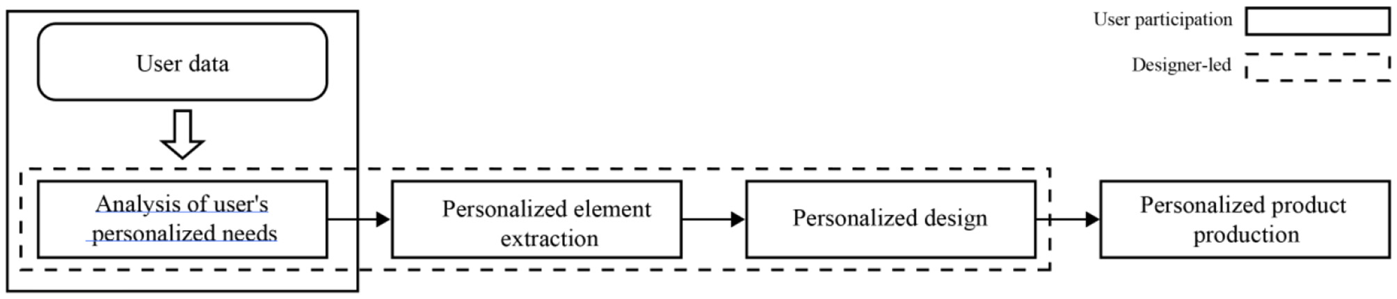 Traditional personalized products are roughly divided into four links from design to production: user personalized demand analysis, personalized element extraction, personalized design, and personalized product production. In this design process, the designer occupies a dominant position, and user data are only involved in the analysis of the individual needs of the user in the early stage. In the subsequent design links, the designer controls the subsequent process as the lead, as shown in Figure 11. To better serve users and meet their emotional needs, future intelligent personalized design methods need to allow more user data to participate in the entire design process, and the entire design process should be more dominated by users or user data. The sense of participation of the user should be enhanced to achieve true participatory consumption. The role of the designer in this process should be a designer of the personalized design system. Its main task is to combine new technology to complete the design of the personalized system and the interactive process of user participation in the personalized design, as shown in Figure 12. After finishing these tasks, the designer transfers the leading power to the user, allowing the personalized system and the user to cooperate with each other to complete the design process together and allowing the user to complete the customization of personalized products according to their personal preferences and realize the real sense of “thousands of needs” design.