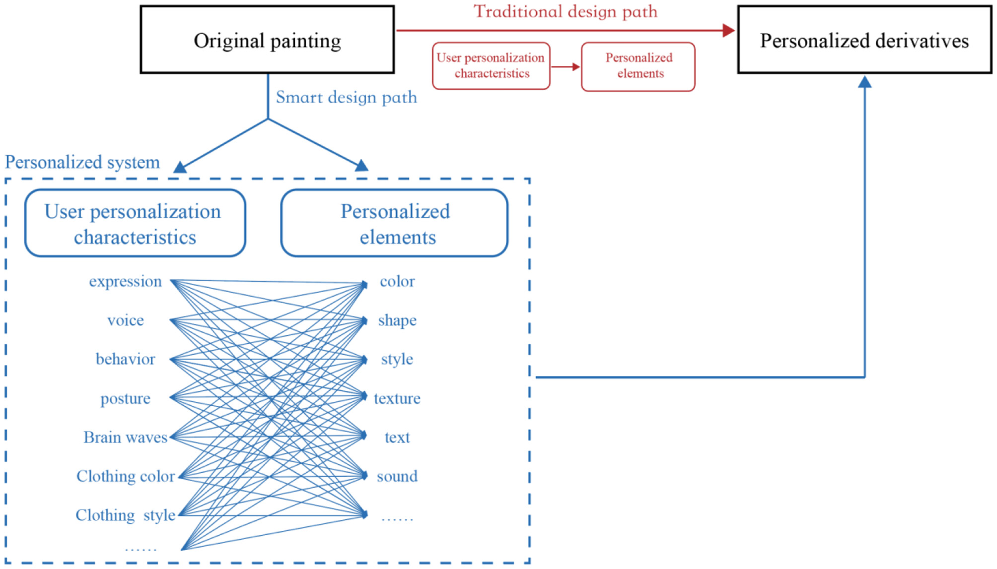In art derivative design, designers use modern design methods to popularize artistic connotations into the modern landscape by thinking, transforming, and designing after fully understanding the connotation of the derived original art. It enables derivatives to meet the spiritual needs of users by carrying a certain artistic connotation. Unlike ordinary products, the willingness of users to buy art derivatives is more out of a desire for the exhibit or works of art in the exhibit. Therefore, it is important for art derivatives to meet the emotional needs of users as much as possible. With the advent of the era of participatory consumption, an increasing number of derivative designs have begun to incorporate personalized factors; only carrying the artistic connotation of art derivatives cannot simply meet the emotional needs of users. The addition of personalized elements can help to realize the prominent and differentiated embodiment of the personal meaning of consumers, accordingly establishing the emotional connection between derivatives and users. Therefore, the combination of derivatives and personalization is an inevitable trend in the design of art derivatives. However, from the current situation of derivative design, the current product form is immutable, the design method is monotonous, and the cost to meet personalized design needs is high. Therefore, future derivative design has to not only meet the demand for the thousands of needs of people in quantity but also realize the meaning connection between individuals and products from the perspective of consumer psychology to be meaningfully accurate to the individual users.